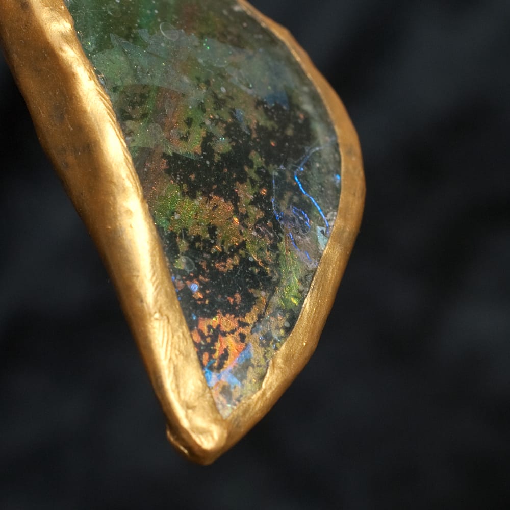 カラフルで星空の様な輝きを持つローマンガラスは、ローマ時代の人が使用したガラス製品が、遺物として土の下に埋まり、化学変化を起こして出来上がったものです。