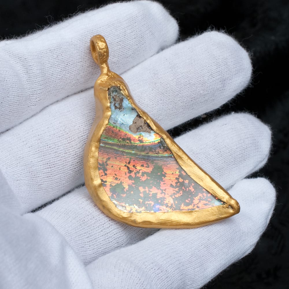 ローマンガラスとは、はるか昔、ローマ帝政開始の紀元前27年から、ローマ帝国の東西分裂(紀元後後395年)までの約5世紀間に、ローマ帝国内で製造・流通したガラス製品です。こちらのペンダントトップになっているローマンガラスは、東西文化の交流地点であった中央アジアと南アジアの交差点で出土したものです。遙かローマから、駱駝の隊商に載せられて、長旅の後に中央アジアと南アジアの交差点にたどり着きました。ローマから運ばれたガラスは古代の人たちに使用されたあと、何らかの理由で土の下に眠ったのだと思われます。