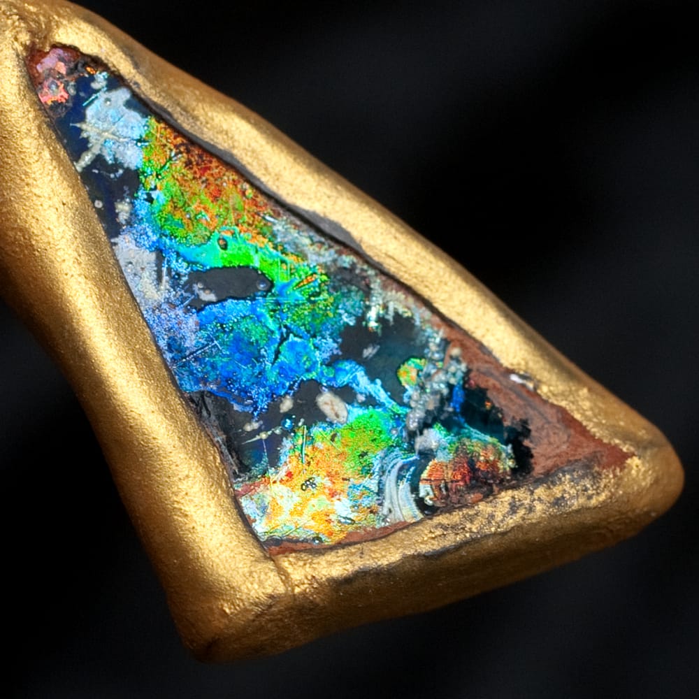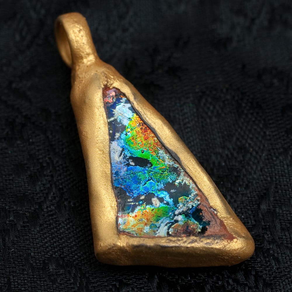 カラフルで星空の様な輝きを持つローマンガラスは、ローマ時代の人が使用したガラス製品が、遺物として土の下に埋まり、化学変化を起こして出来上がったものです。