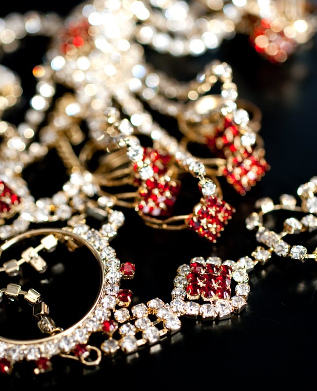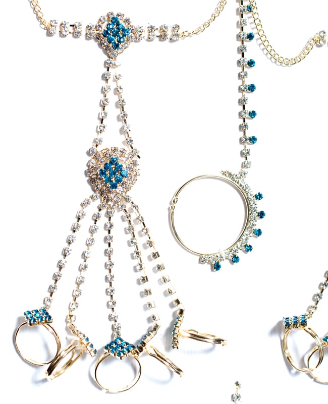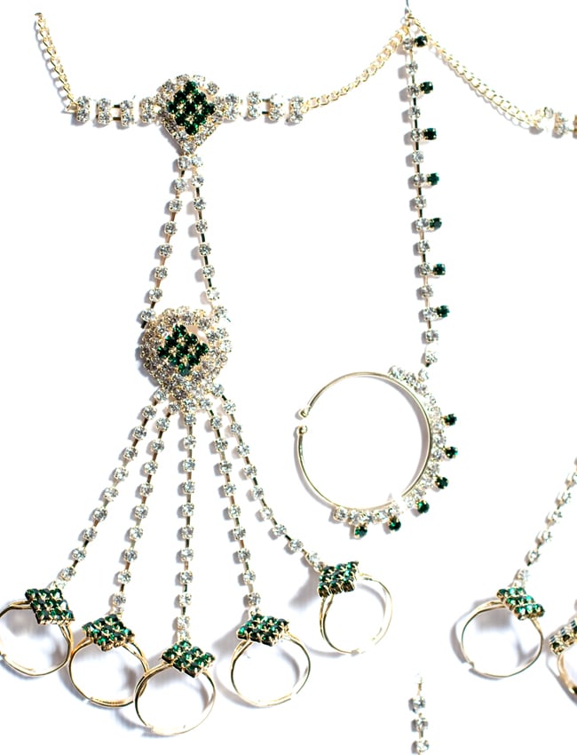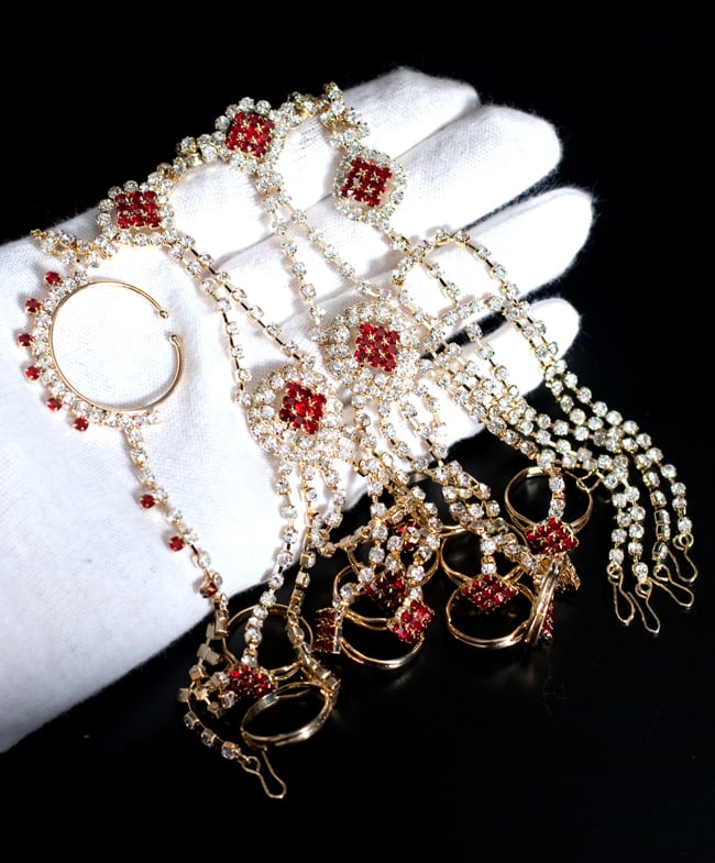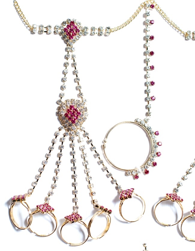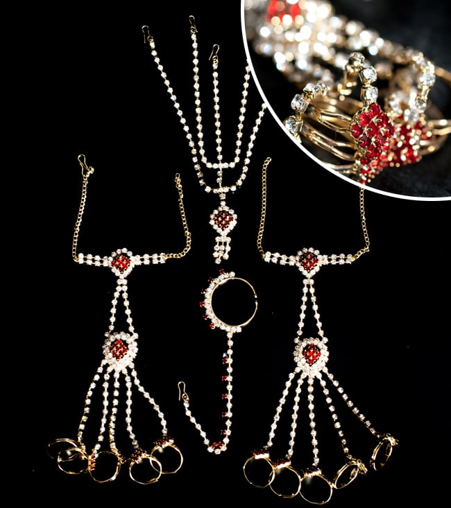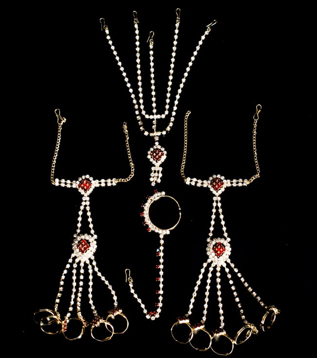 「インドのアクササリーってゴージャスだけど、コーディネイトが難しくて…」とお悩みのあなたにオススメしたいのが、こちらのセットです。派手すぎずシンプルかつ、存在感のあるラインストーンが付いたバランスの良いパンジャ・ティッカ・ノーズリングの組み合わせがセットに!パンジャは両手分付いています。あらかじめ同系統のカラーやデザインで統一されているので、どういう風に組み合わせればいいのかと迷う必要は一切なし!いまこそ美を極め、ボリウッドスターのように輝いてみませんか?!こちらのアクセサリーがやってきたのはインドファッションの中心地、ムンバイ。照明との相性もよく光を受けて美しく輝きます。パーティーの時など華やかに彩りたい様々なシチュエーションで活躍してくれます。