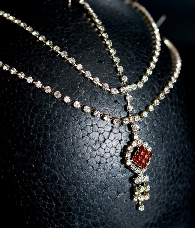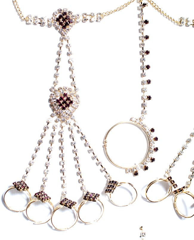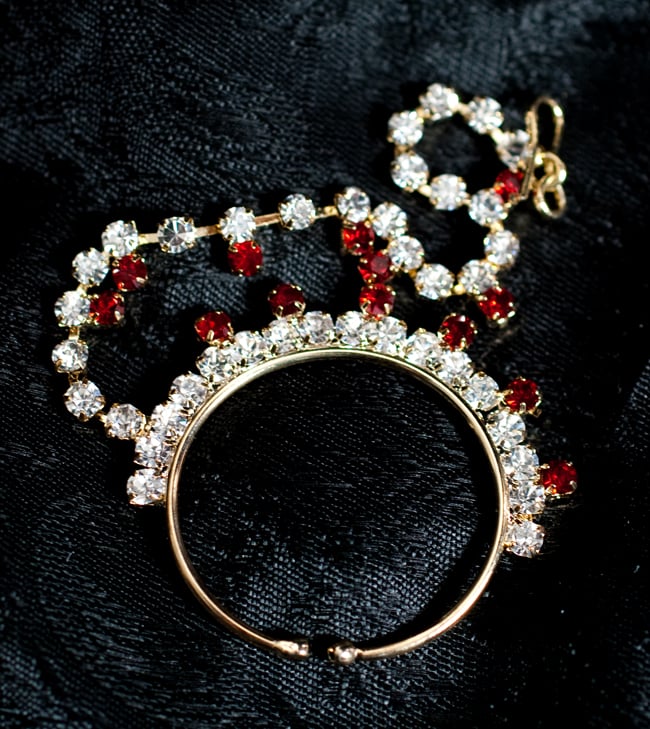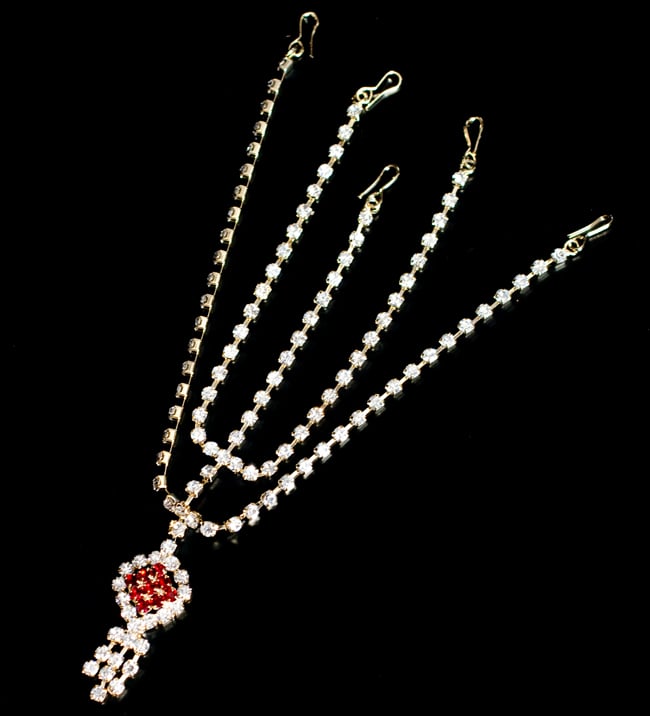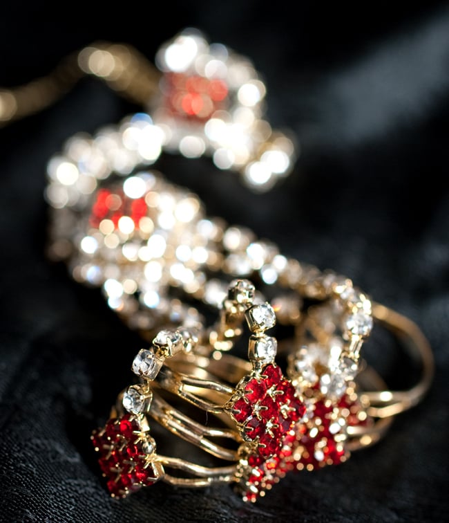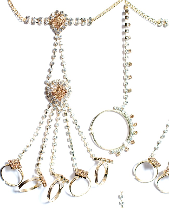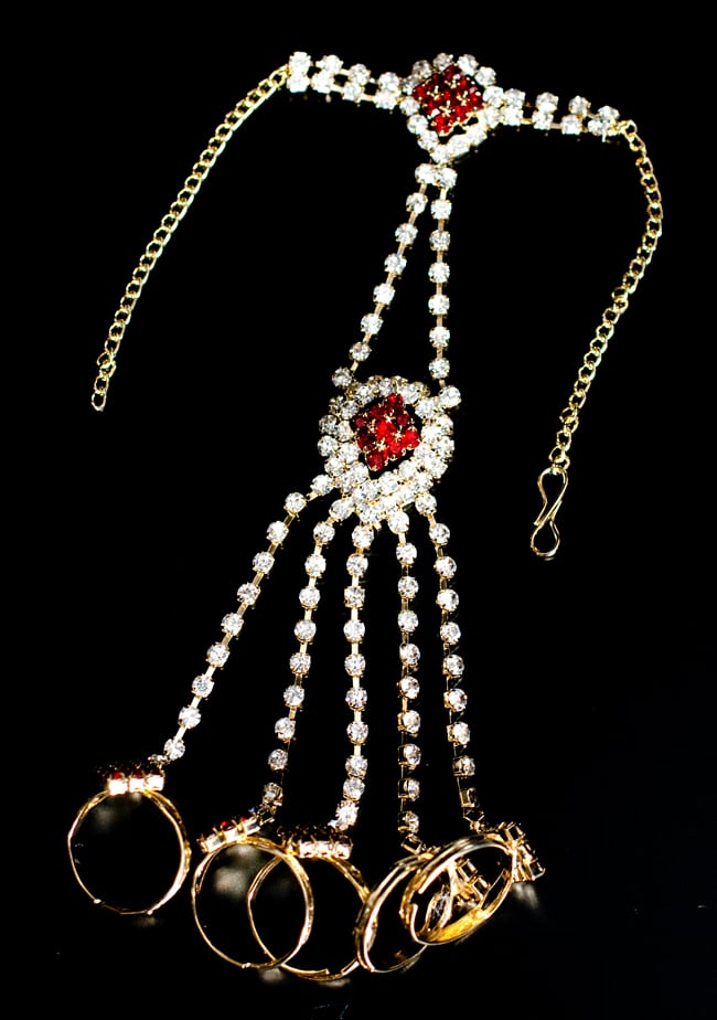 「インドのアクササリーってゴージャスだけど、コーディネイトが難しくて…」とお悩みのあなたにオススメしたいのが、こちらのセットです。派手すぎずシンプルかつ、存在感のあるラインストーンが付いたバランスの良いパンジャ・ティッカ・ノーズリングの組み合わせがセットに!パンジャは両手分付いています。あらかじめ同系統のカラーやデザインで統一されているので、どういう風に組み合わせればいいのかと迷う必要は一切なし!いまこそ美を極め、ボリウッドスターのように輝いてみませんか?!こちらのアクセサリーがやってきたのはインドファッションの中心地、ムンバイ。照明との相性もよく光を受けて美しく輝きます。パーティーの時など華やかに彩りたい様々なシチュエーションで活躍してくれます。