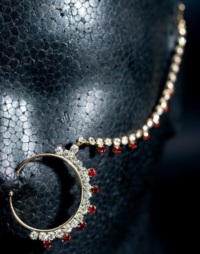 フックを頭頂部にひっかけ、髪の分け目に沿うようにしてお使いいただけます。本体部分が額のところにかかる感じになります。頭頂部につける際は、Uピンなどを使うと付けやすいと思います。■ノーズピアスはノンホールタイプ