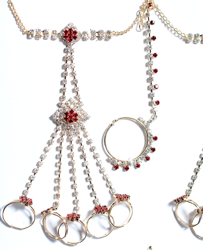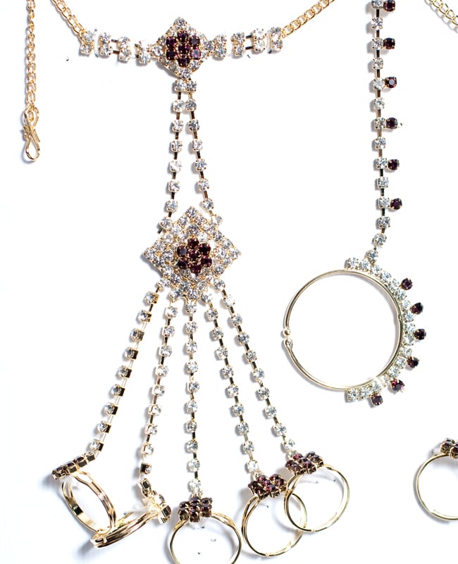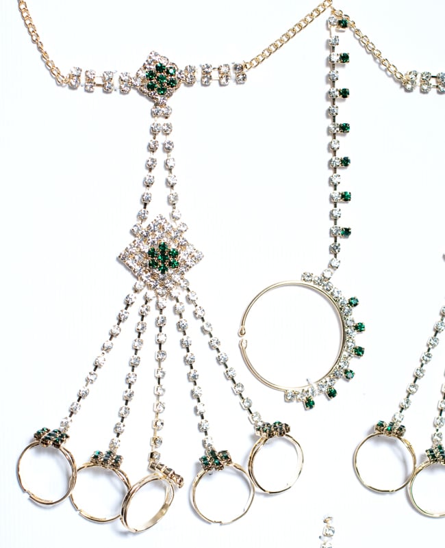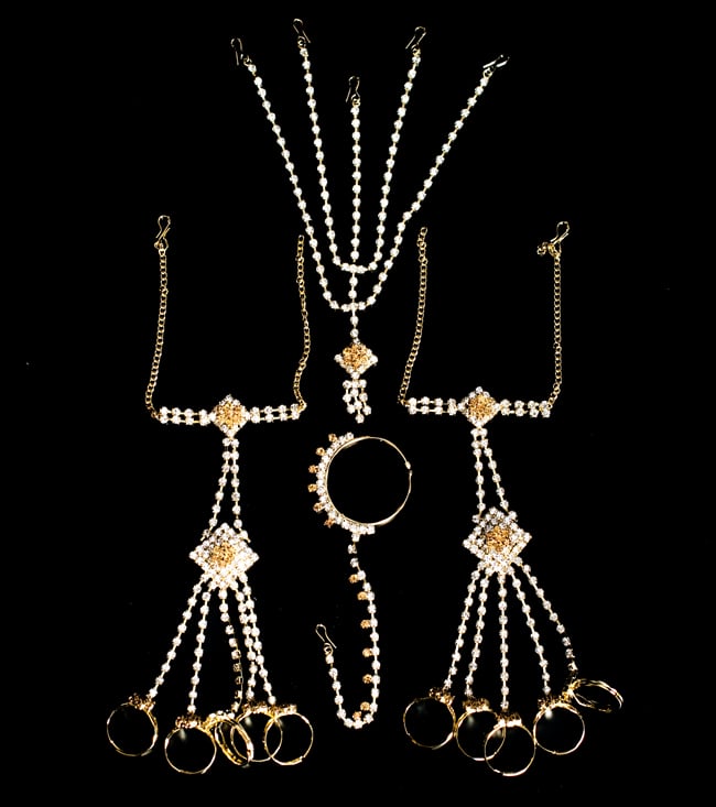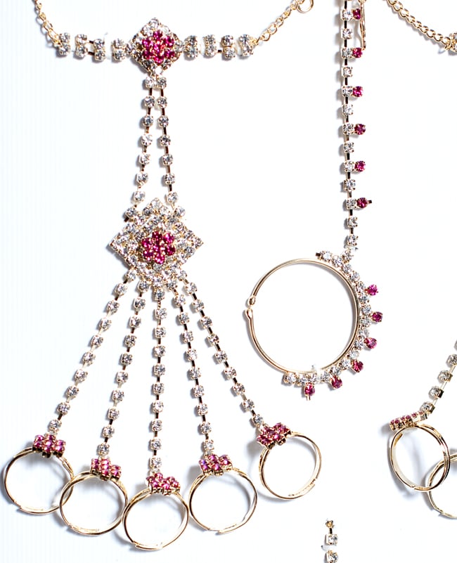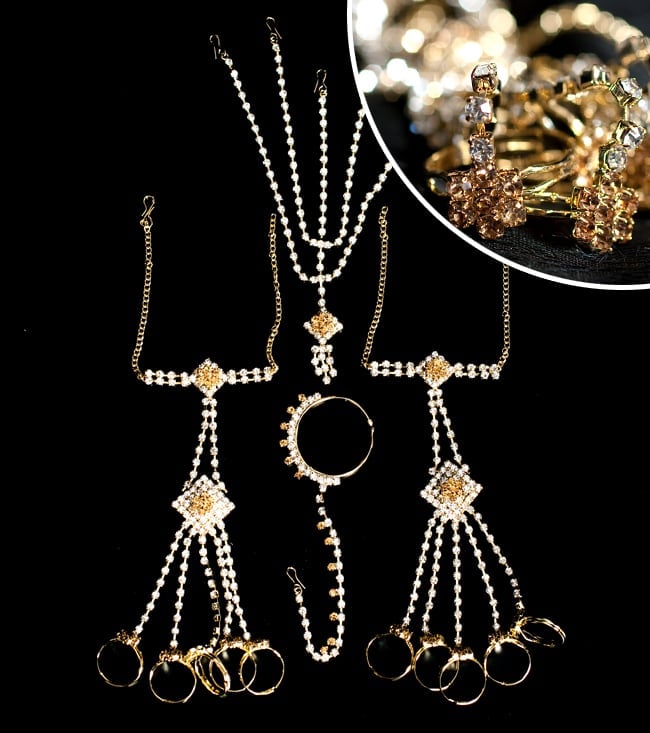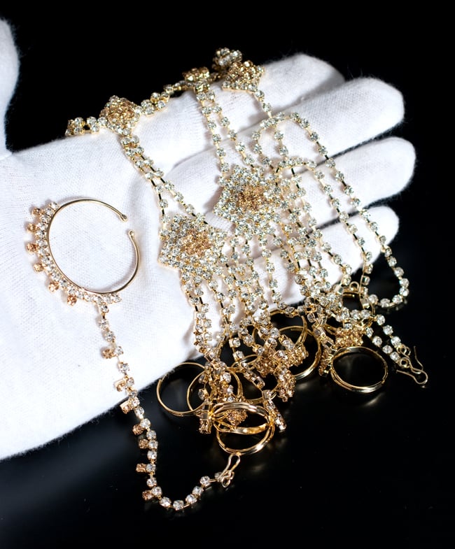 「インドのアクササリーってゴージャスだけど、コーディネイトが難しくて…」とお悩みのあなたにオススメしたいのが、こちらのセットです。派手すぎずシンプルかつ、存在感のあるラインストーンが付いたバランスの良いパンジャ・ティッカ・ノーズリングの組み合わせがセットに!パンジャは両手分付いています。あらかじめ同系統のカラーやデザインで統一されているので、どういう風に組み合わせればいいのかと迷う必要は一切なし!いまこそ美を極め、ボリウッドスターのように輝いてみませんか?!こちらのアクセサリーがやってきたのはインドファッションの中心地、ムンバイ。照明との相性もよく光を受けて美しく輝きます。パーティーの時など華やかに彩りたい様々なシチュエーションで活躍してくれます。