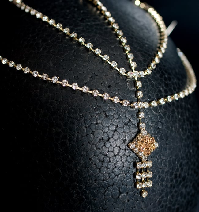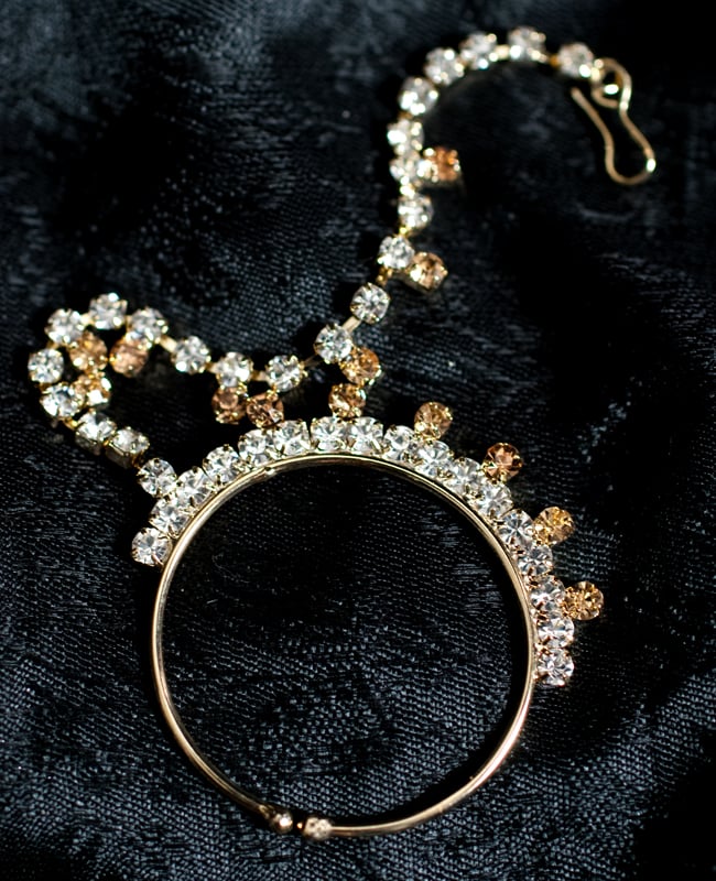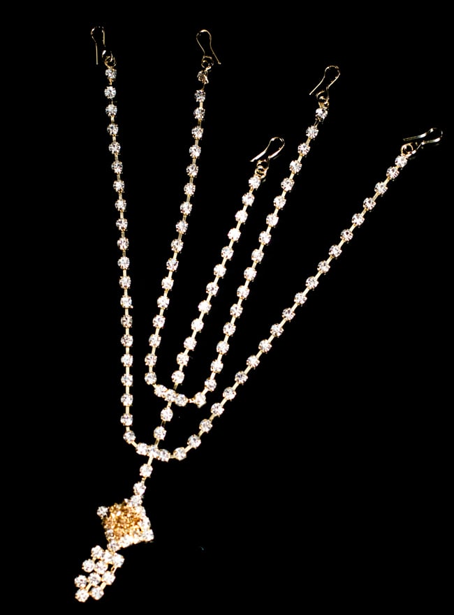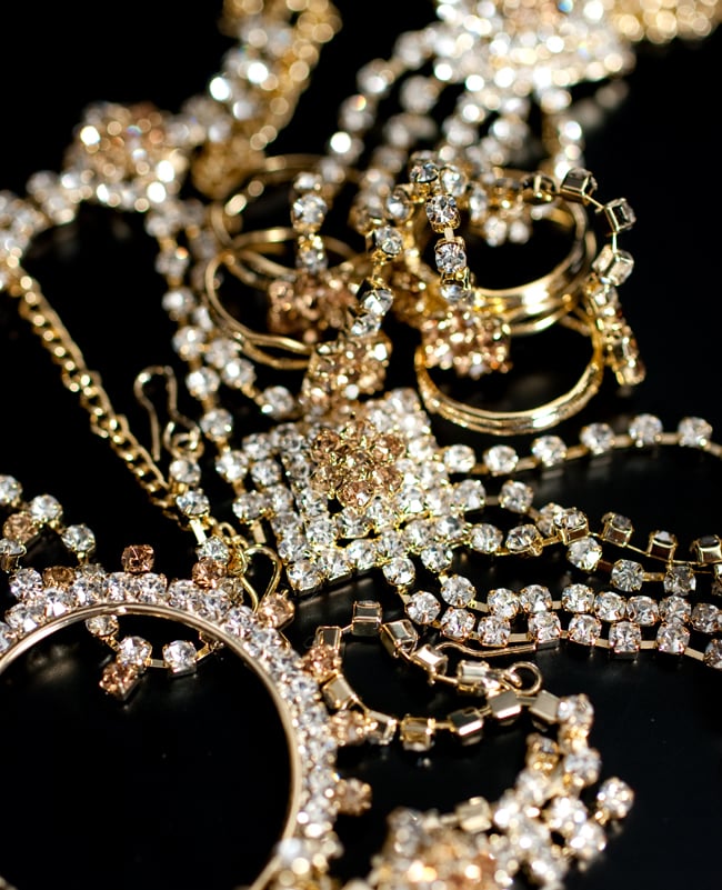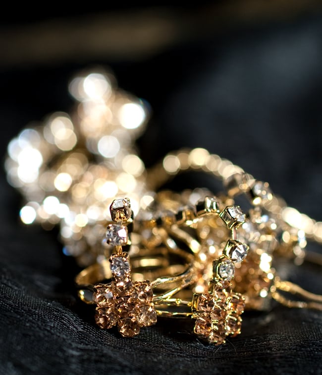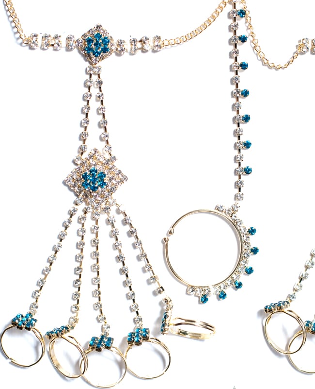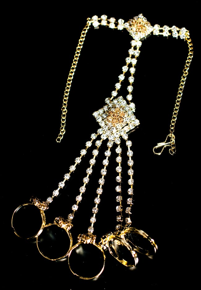 「インドのアクササリーってゴージャスだけど、コーディネイトが難しくて…」とお悩みのあなたにオススメしたいのが、こちらのセットです。派手すぎずシンプルかつ、存在感のあるラインストーンが付いたバランスの良いパンジャ・ティッカ・ノーズリングの組み合わせがセットに!パンジャは両手分付いています。あらかじめ同系統のカラーやデザインで統一されているので、どういう風に組み合わせればいいのかと迷う必要は一切なし!いまこそ美を極め、ボリウッドスターのように輝いてみませんか?!こちらのアクセサリーがやってきたのはインドファッションの中心地、ムンバイ。照明との相性もよく光を受けて美しく輝きます。パーティーの時など華やかに彩りたい様々なシチュエーションで活躍してくれます。