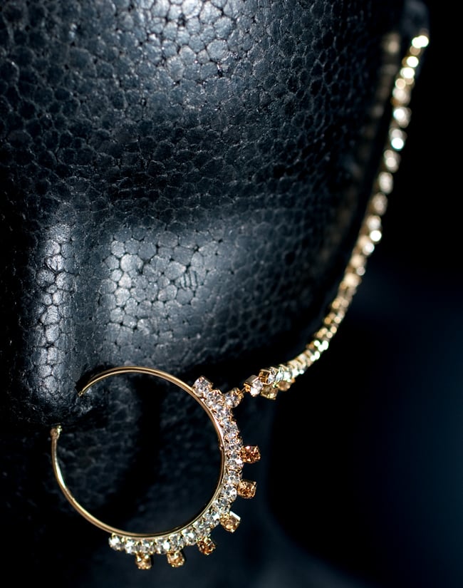 フックを頭頂部にひっかけ、髪の分け目に沿うようにしてお使いいただけます。本体部分が額のところにかかる感じになります。頭頂部につける際は、Uピンなどを使うと付けやすいと思います。■ノーズピアスはノンホールタイプ