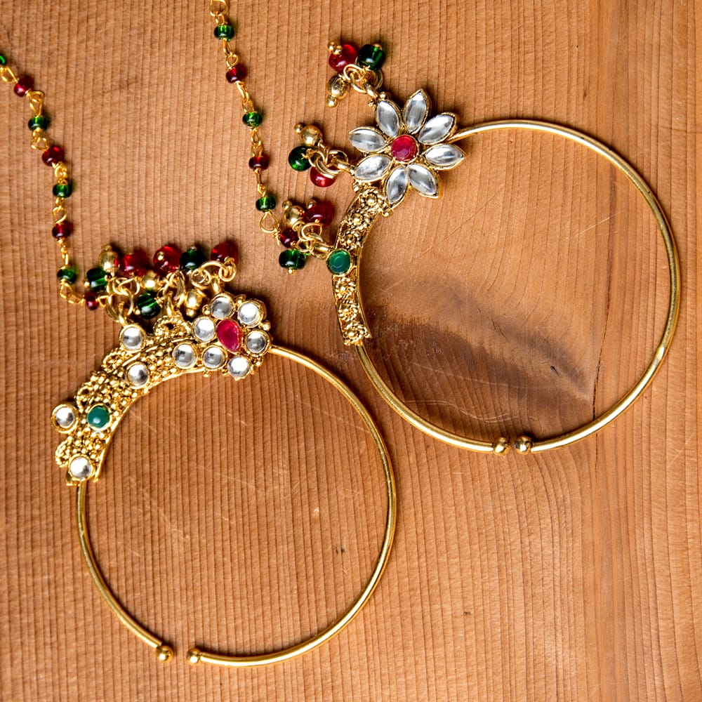 ボリウッド映画の、特に結婚式のシーンでノーズリングを付けている女優さんを見ることがあると思います。こちらのノーズリングは、光を受けるとビーズやイミテーションのストーンがキラキラと輝き、映画に出てくるような、ゴージャスで美しい一品です。■穴をあけずに簡単装着
