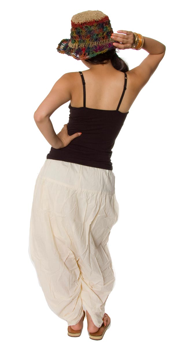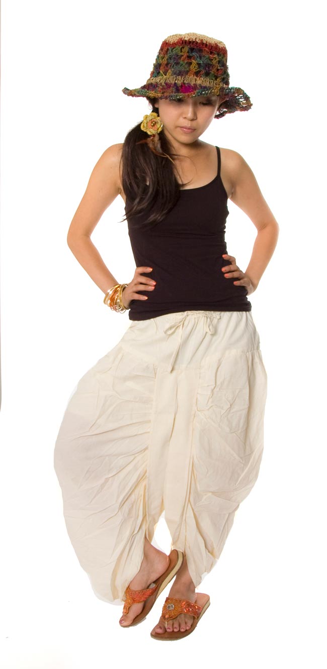 このパンツの特徴はなによりもこの形!思わずどうなってるの??と確認したくなる不思議なパンツです。合わせた布の間から、ちゃんと足が出てとても履きやすいですよ。