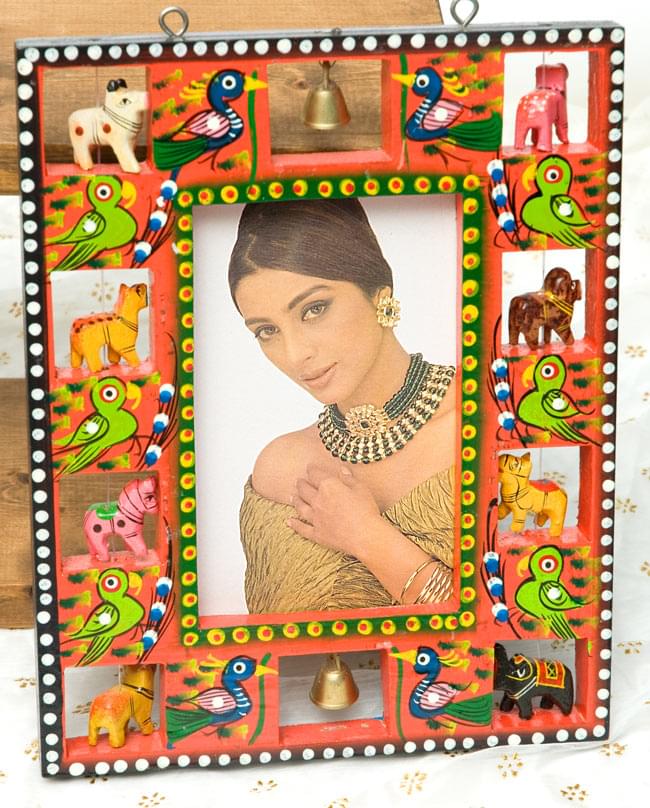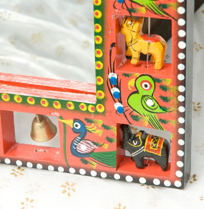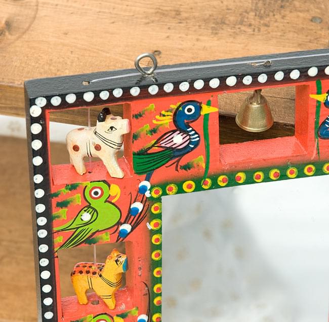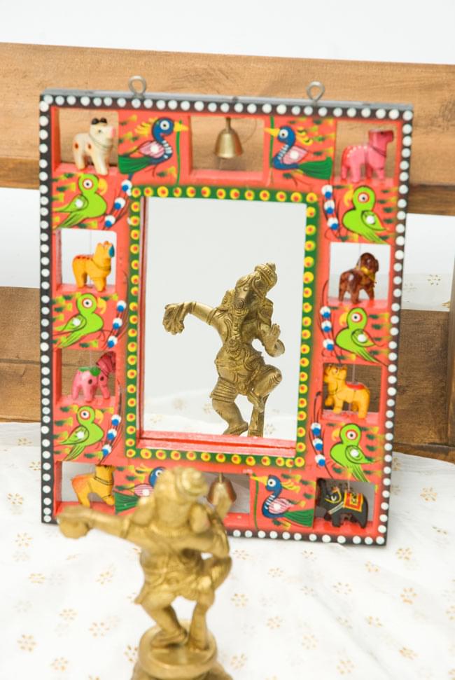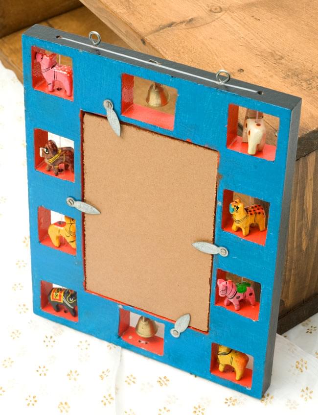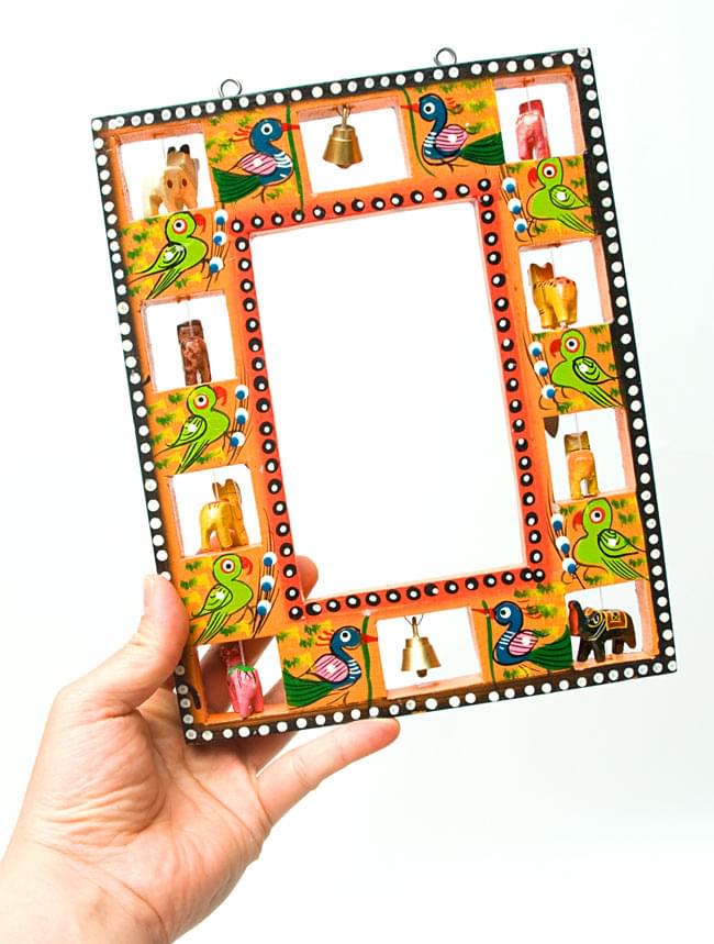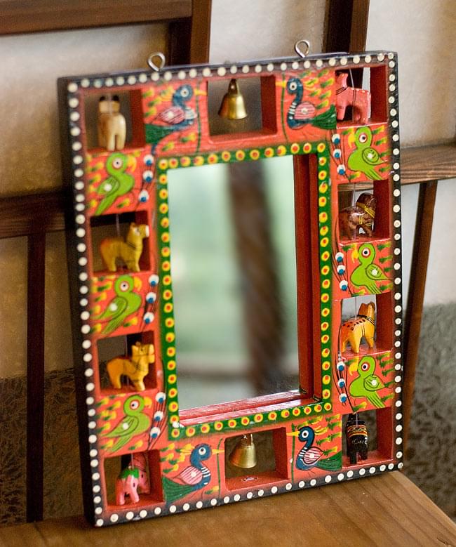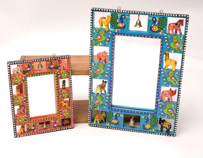 職人がインドにいる動物を一つ一つ削り、彩色しているので、とても温かみのある仕上がりになっています。また、鏡は簡単に取外すことができ、代わりに写真やポストカードを入れることが出来ます。フォトフレームとしてもお使いいただけますね!