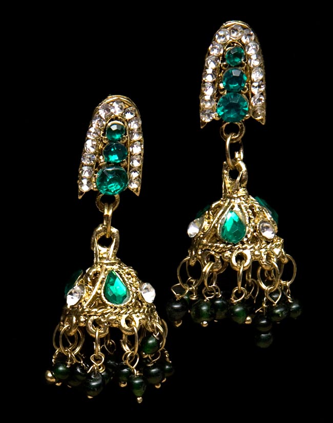 つりがね型のドームを初めとするインドらしい形。フェイクジュエリーの使い方、ピアスのフックの形までどれもインドの香りを感じさせてくれますね。ちょっと大きめで目立つピアスですので、ベリーダンスの発表の時や、派手なファッションの時、パーティーの時まで色々なシチュエーションで活躍してくれるピアスです。