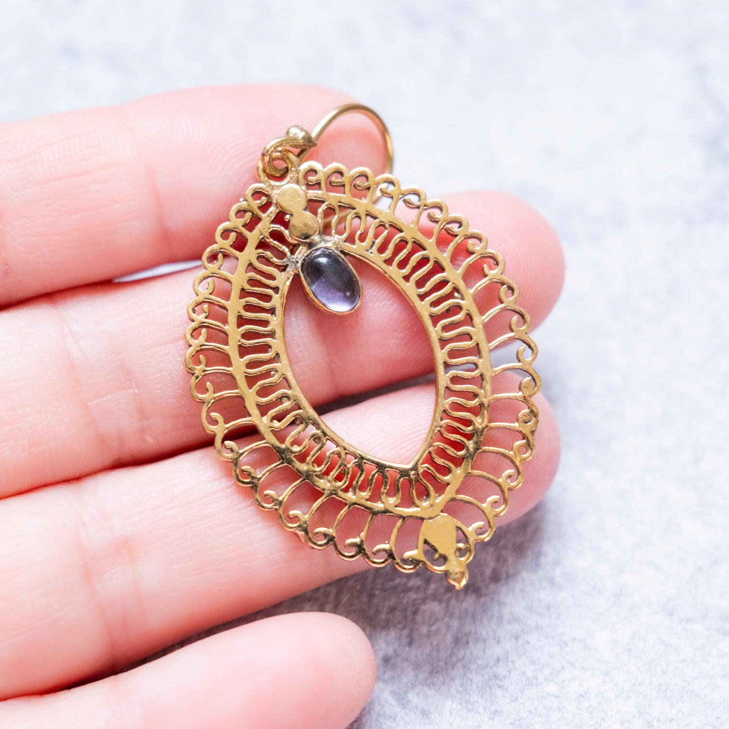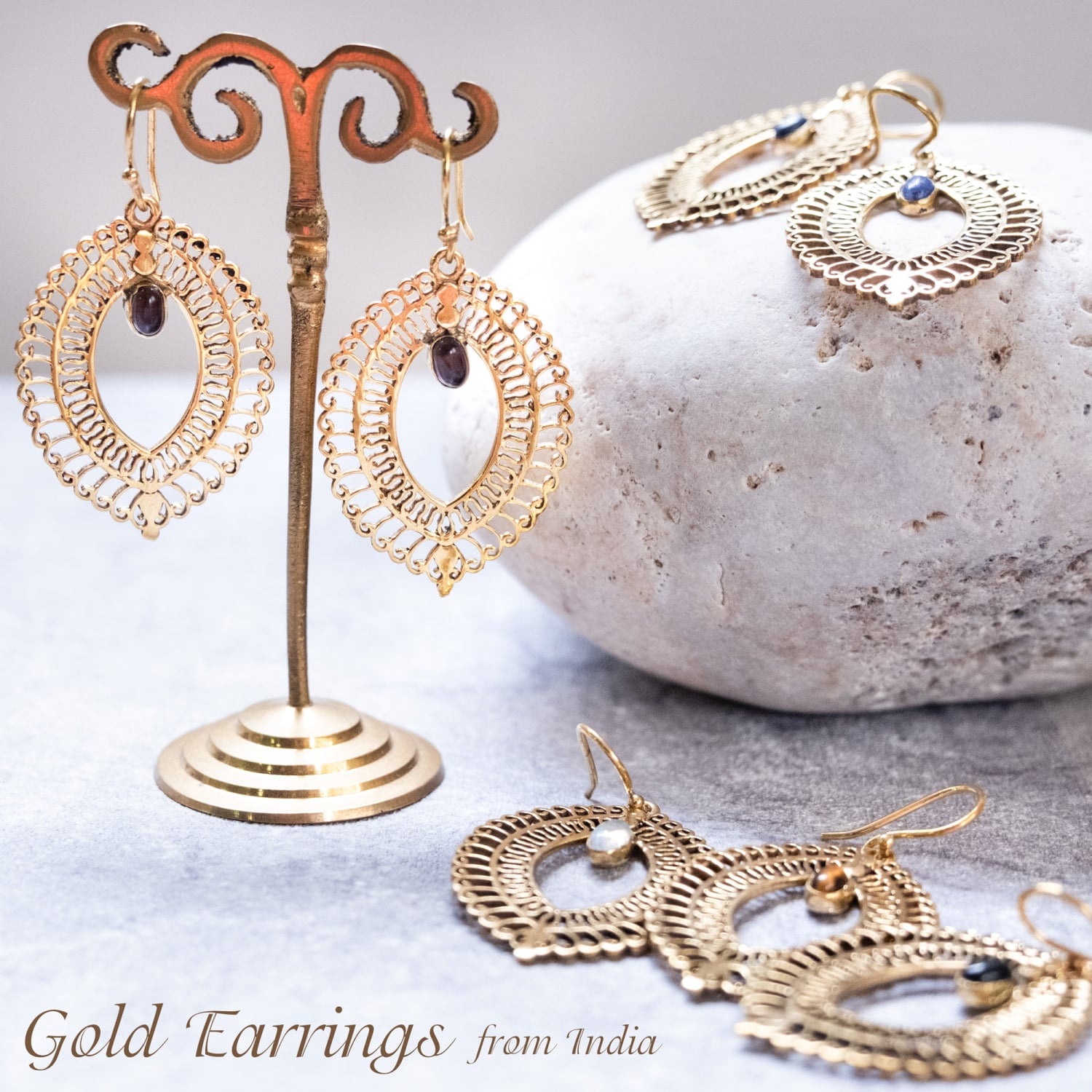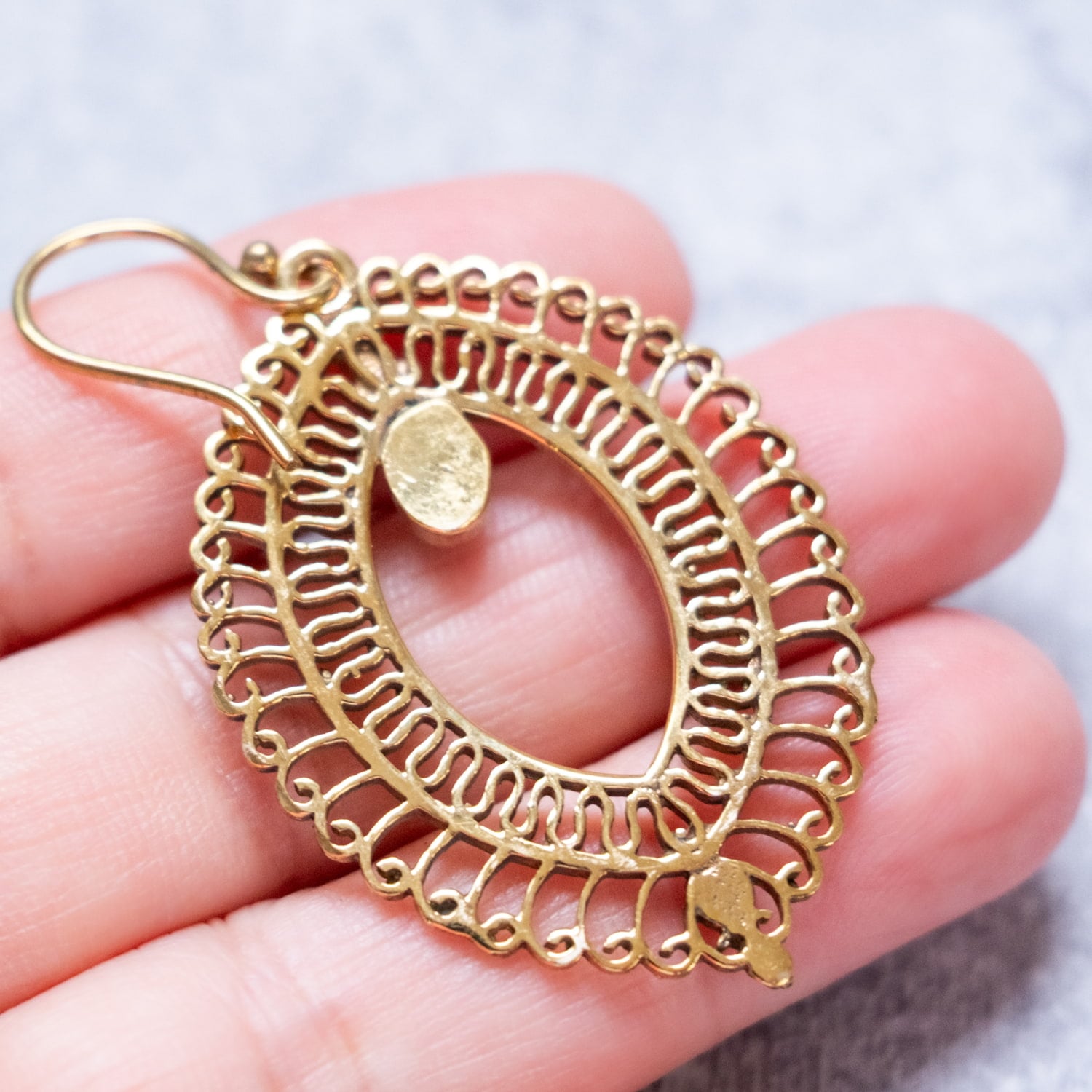このピアスは古くから文化の交流地点であったデリーで作られている一品です。デリーはインドの首都ですが、千年以上も前からいろいろな旅人を受け入れてきた土地柄です。それ故に彼らの作るデザインの中にはどことなく中東やアラビアンな雰囲気が顔を覗かせ、ただ単純に「インドらしい」だけではない、なだらかに過ぎた時の流れを感じさせるような魅力あります。