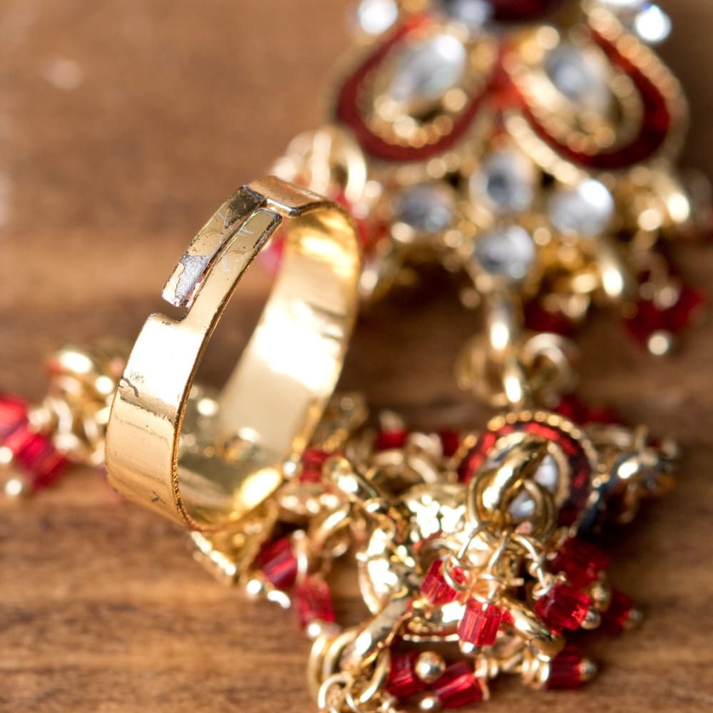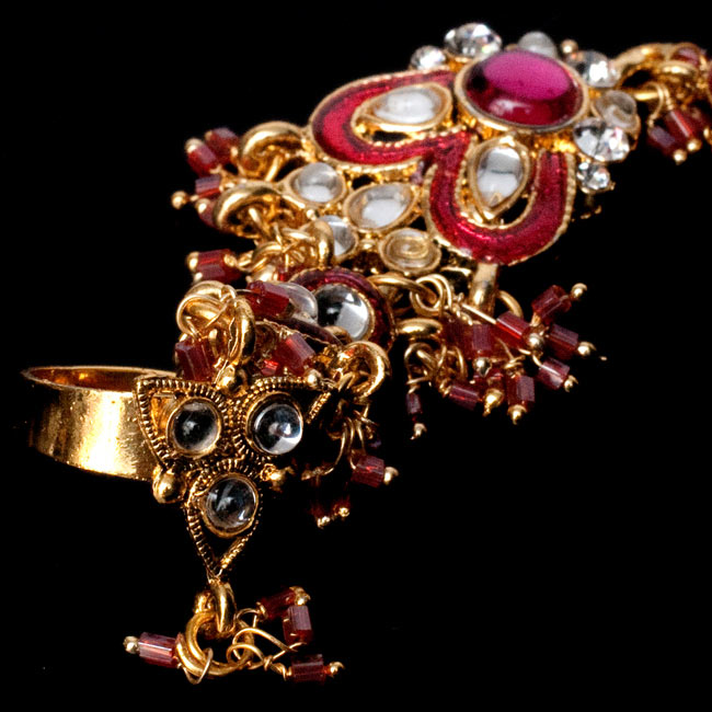 インドで結婚式や、パーティーなど晴れの時に手を飾るゴージャスなアクセサリー、パンジャです。中指に付けるリングから、腕のブレスレットまでつながった装飾は綺麗!!の一言。リングは一方が切れているフリーサイズなのできっとどんな方の手にもフィットします。すべての指にリングをはめる5本指タイプなども良いですが、こちらはシングルタイプならではの上品さがあると思います。