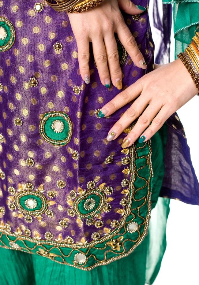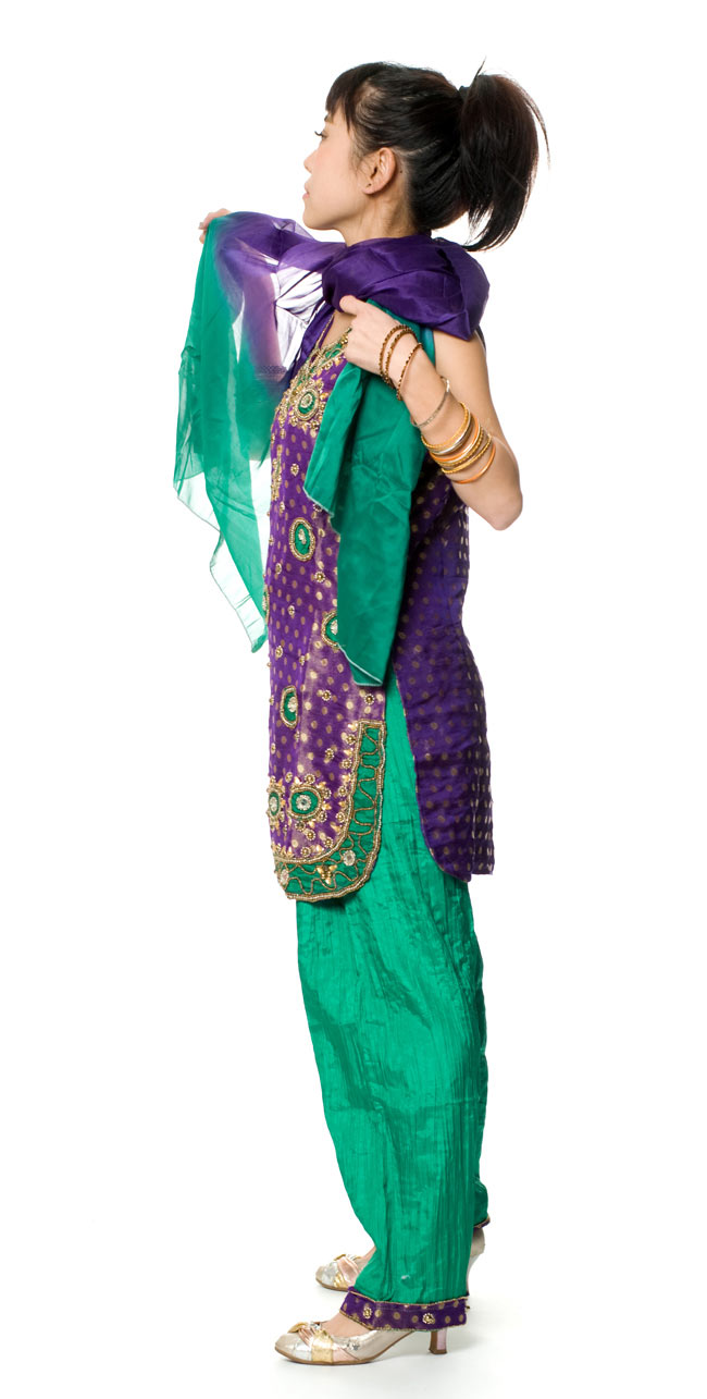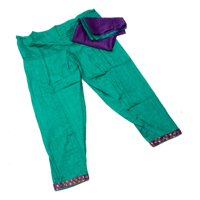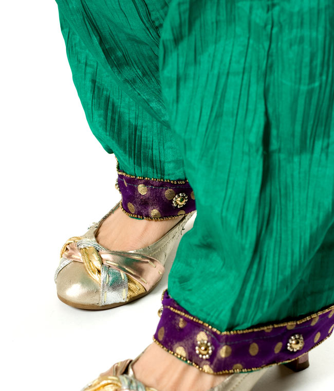 パンツのシルエットはいくつか種類があり、次のように分かれています。ゆったりとした「サルワール」、膝辺りから足首までがタイトになっている「チューリーダール、裾がラッパ状に広がった「ベルボトム」。合わせる靴は自由ですが、ある程度ヒールのある靴で合わせてみるとカッコ良いと思います。また、サルワールとチューリーダールはウエストが1m以上あるのが一般的と言われており、付属の紐を通し、きゅっと縛って履きこなして下さい。★こちらのデザインは、腕まわりが小さいデザインとなっております。肩幅のある方などは着脱しにくい可能性もございます。ご注意下さいませ。