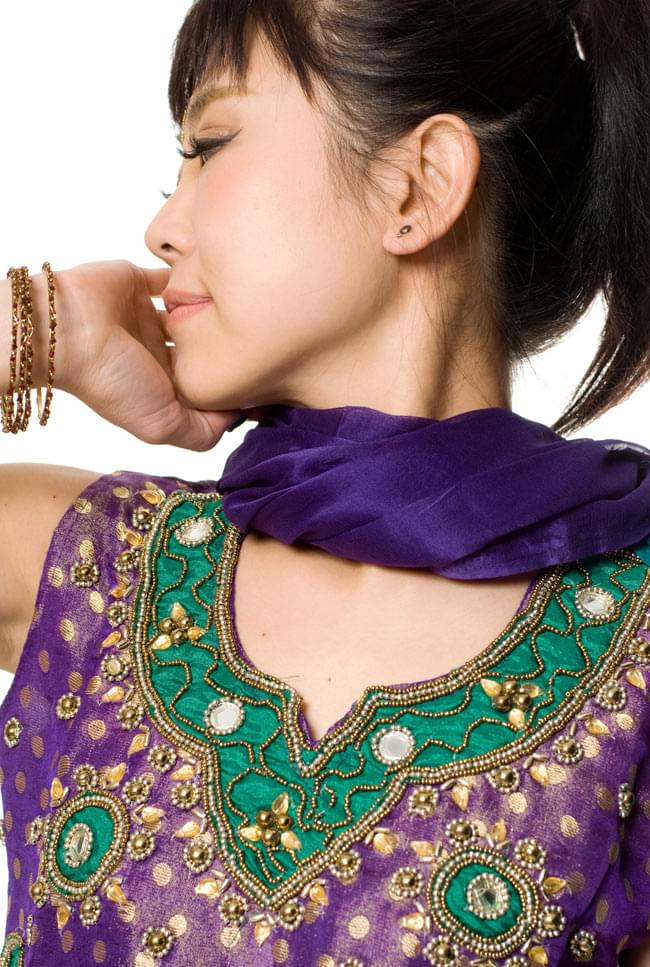 またの名を「サルワール・カミーズ」とも呼ばれる、南アジアの民族衣装です。シャツを意味する「カミーズ」、ズボンを意味する「サルワール」、「ドゥパッタ」と呼ばれるショールの3点セットで着用します。3点セットなので、お色味もコーディネートされていてとても統一感があります。インドでは、サリーに比べると若年層が愛用しているというイメージでしょうか。デザインもパンツなので動きやすくスタイリッシュなデザインとなっています。■スパンコールやビーズ、刺繍で華やか