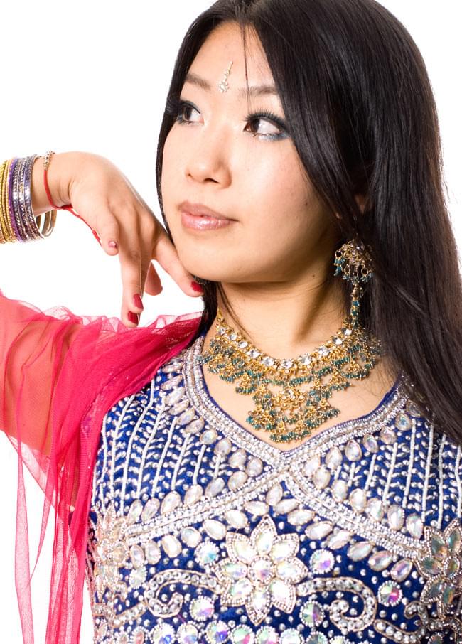 またの名を「サルワール・カミーズ」とも呼ばれる、南アジアの民族衣装です。シャツを意味する「カミーズ」、ズボンを意味する「サルワール」、「ドゥパッタ」と呼ばれるショールの3点セットで着用します。3点セットなので、お色味もコーディネートされていてとても統一感があります。インドでは、サリーに比べると若年層が愛用しているというイメージでしょうか。デザインもパンツなので動きやすくスタイリッシュなデザインとなっています。■スパンコールやビーズ、刺繍で華やか