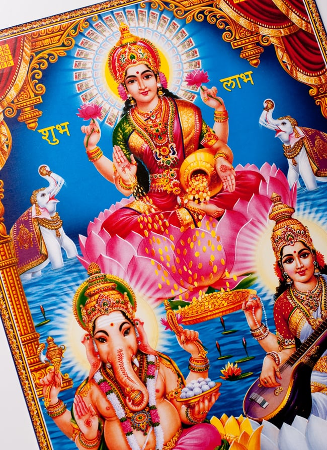 〔約39.2cm×約27.5cm〕インドのヒンドゥー神様ポスター - ラクシュミー・サラスヴァティ・ガネーシャ 通販店