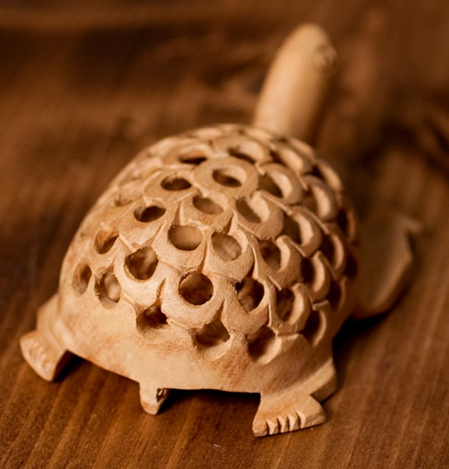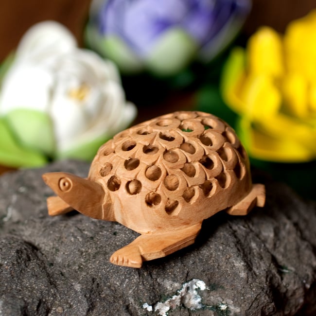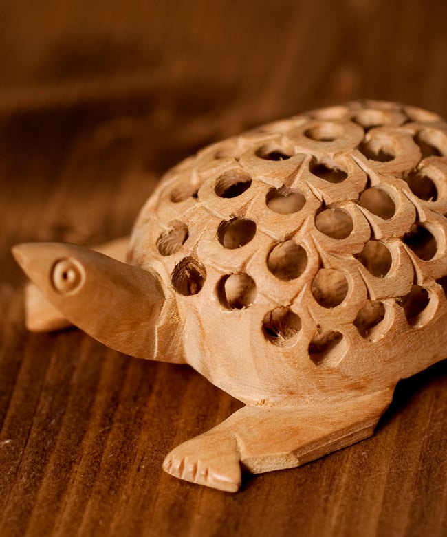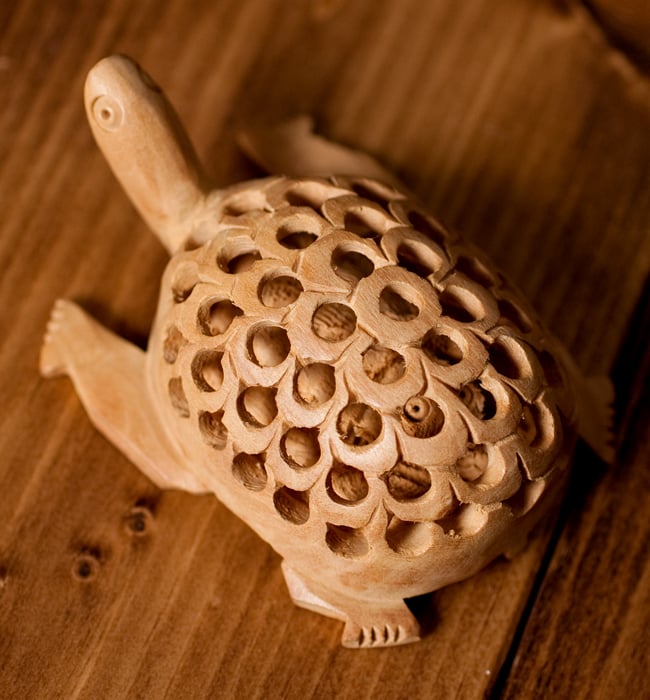 【一木造り】インド職人の手作り透かし彫り木像 ジャリ - タートルの写真