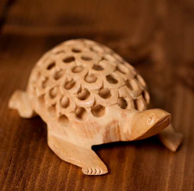 【一木造り】インド職人の手作り透かし彫り木像 ジャリ - タートルの商品写真 1枚目 透かし彫りを施したかわいい動物の像です