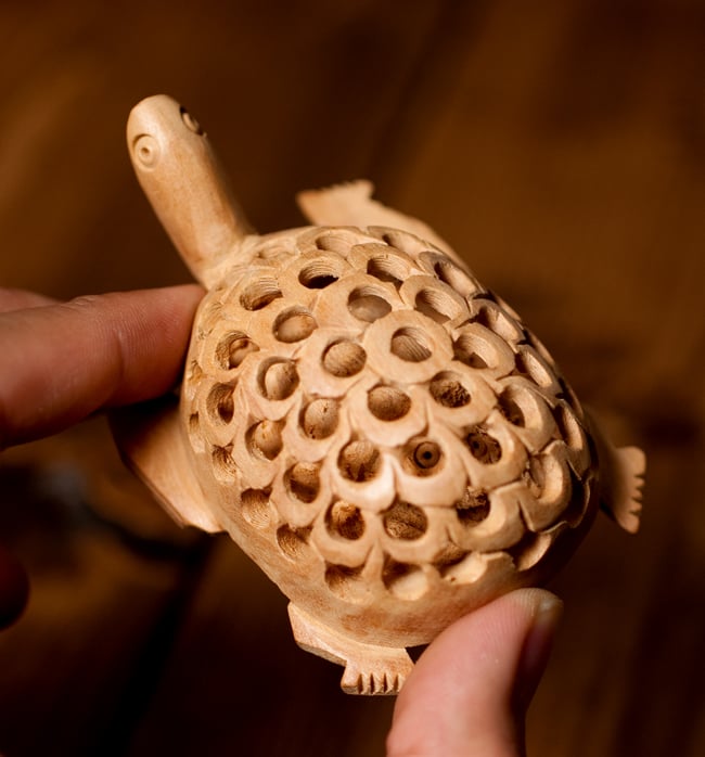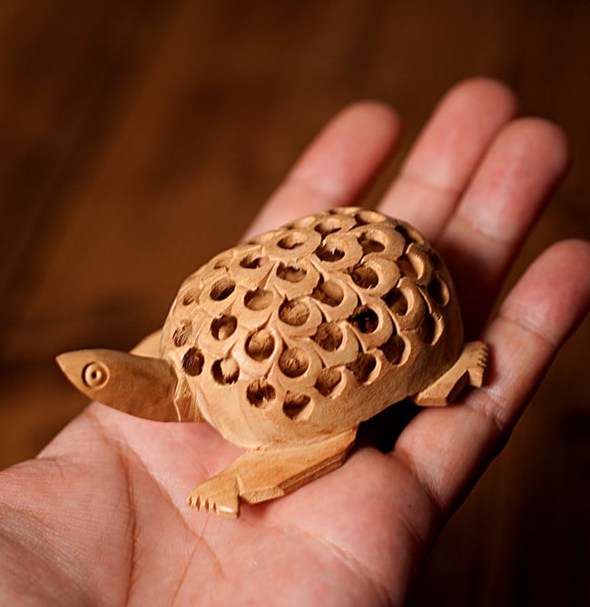 【一木造り】インド職人の手作り透かし彫り木像 ジャリ - タートルの写真【一木造り】インド職人の手作り透かし彫り木像 ジャリ - タートル 2 - 拡大写真です。すべて手づくりの一木造!ハンドメイドのぬくもりに、まるで生きているかのような躍動感があります。【一木造り】インド職人の手作り透かし彫り木像 ジャリ - タートル 3 - 上からの写真です【一木造り】インド職人の手作り透かし彫り木像 ジャリ - タートル 4 - 前からの写真です【一木造り】インド職人の手作り透かし彫り木像 ジャリ - タートル 5 - 後ろはこのようになっております【一木造り】インド職人の手作り透かし彫り木像 ジャリ - タートル 6 - 透かし彫りの中には、小さな外と同じ像が彫られています。ドリルであけた穴からノミを使い作るのは骨の折れる作業です。【一木造り】インド職人の手作り透かし彫り木像 ジャリ - タートル 7 - このくらいのサイズ感です。いろいろな所に置きやすいサイズです。【一木造り】インド職人の手作り透かし彫り木像 ジャリ - タートル 8 - 天然の木を使用し、すべて手づくりで職人がつくっている為、このようにそれぞれ個体差がございます。