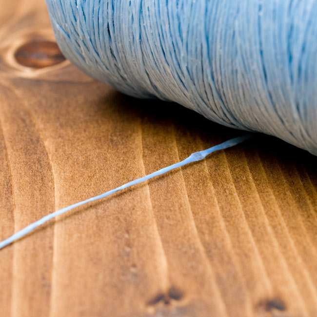 ![ワックスコード - 蝋引き糸 - 440g - 水色[2番 標準] 3 - 質感がわかるように近寄ってみました。蝋でコーティングされているので、とてもしっかり丈夫なのがわかります。たまにロウの塊がありますが問題ありません。](https://www.tirakita.com/ti_nfacs/Photos/ti_nfacs_13_3b.jpg)