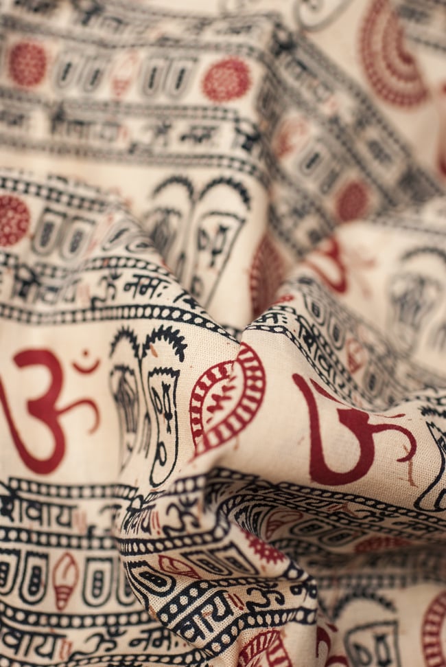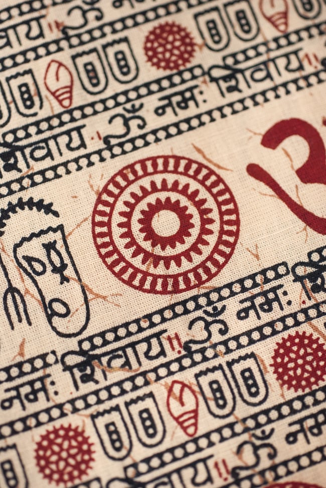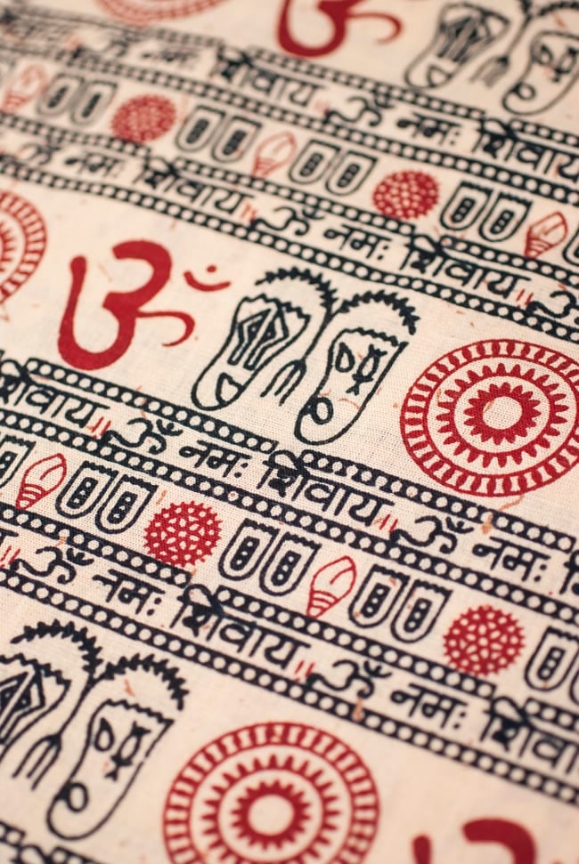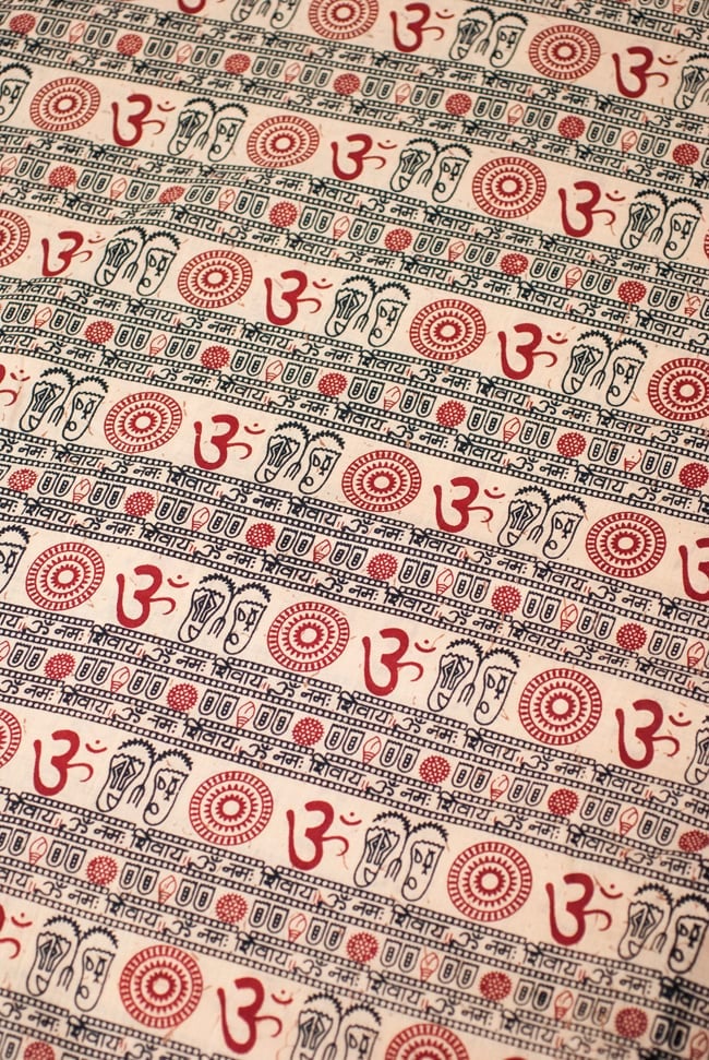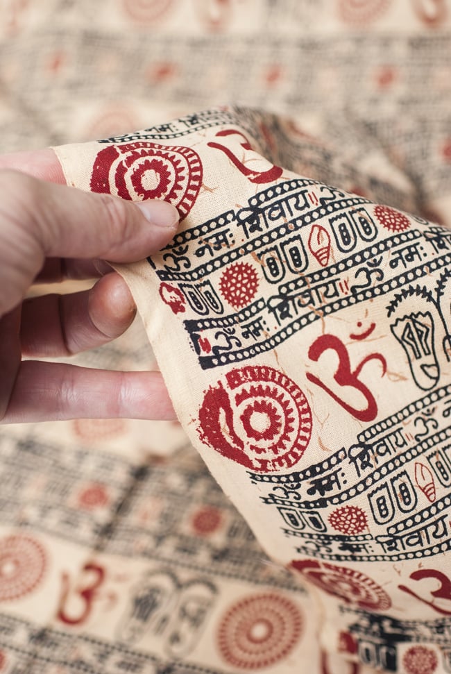 ![[1m単位切り売り]薄手コットンのインド伝統模様布【幅112cm程度】 3 - 二対の模様パターンはヴィシュヌの足の裏を描いています。ヴィシュヌの足の裏には宇宙の全てがあるとして、様々なシンボルが描かれて、広くインドで崇拝されています](https://www.tirakita.com/id_rbtik/Photos/id_rbtik_5_3b.jpg)