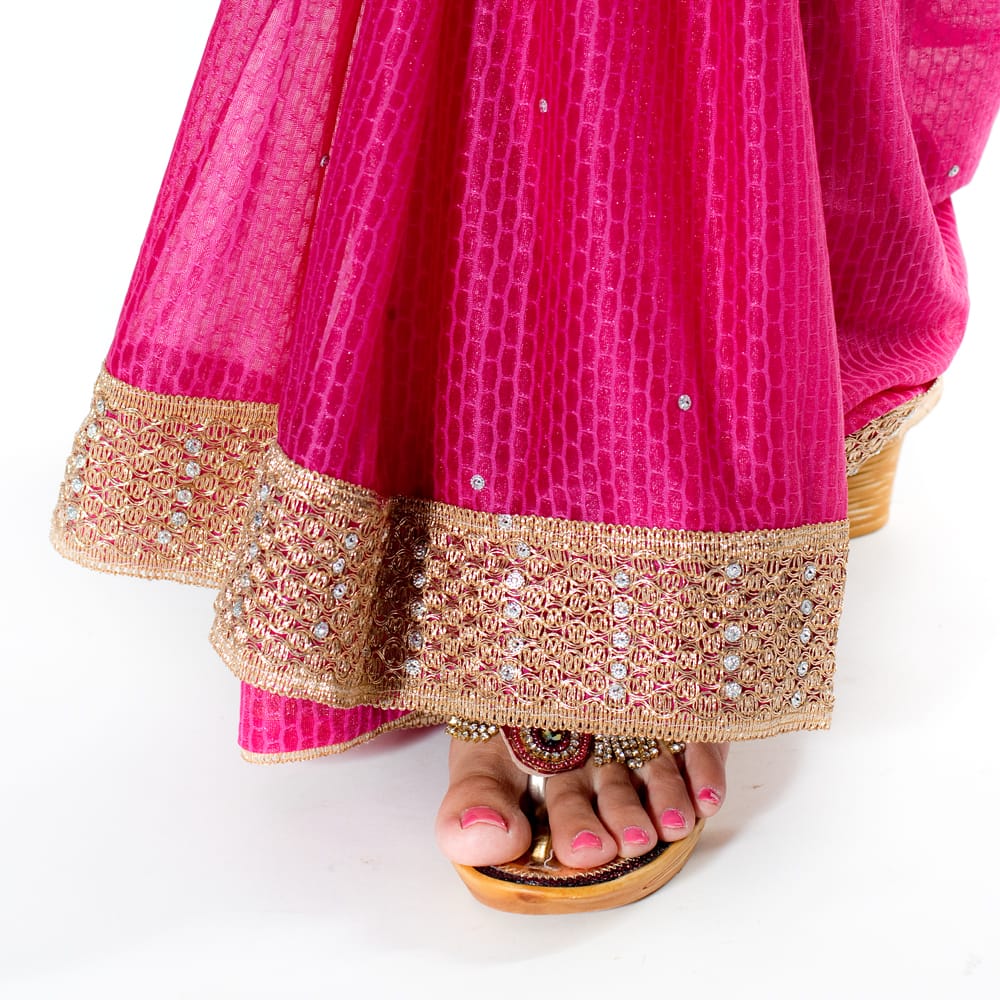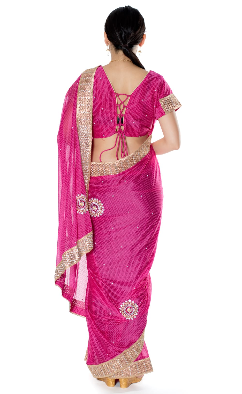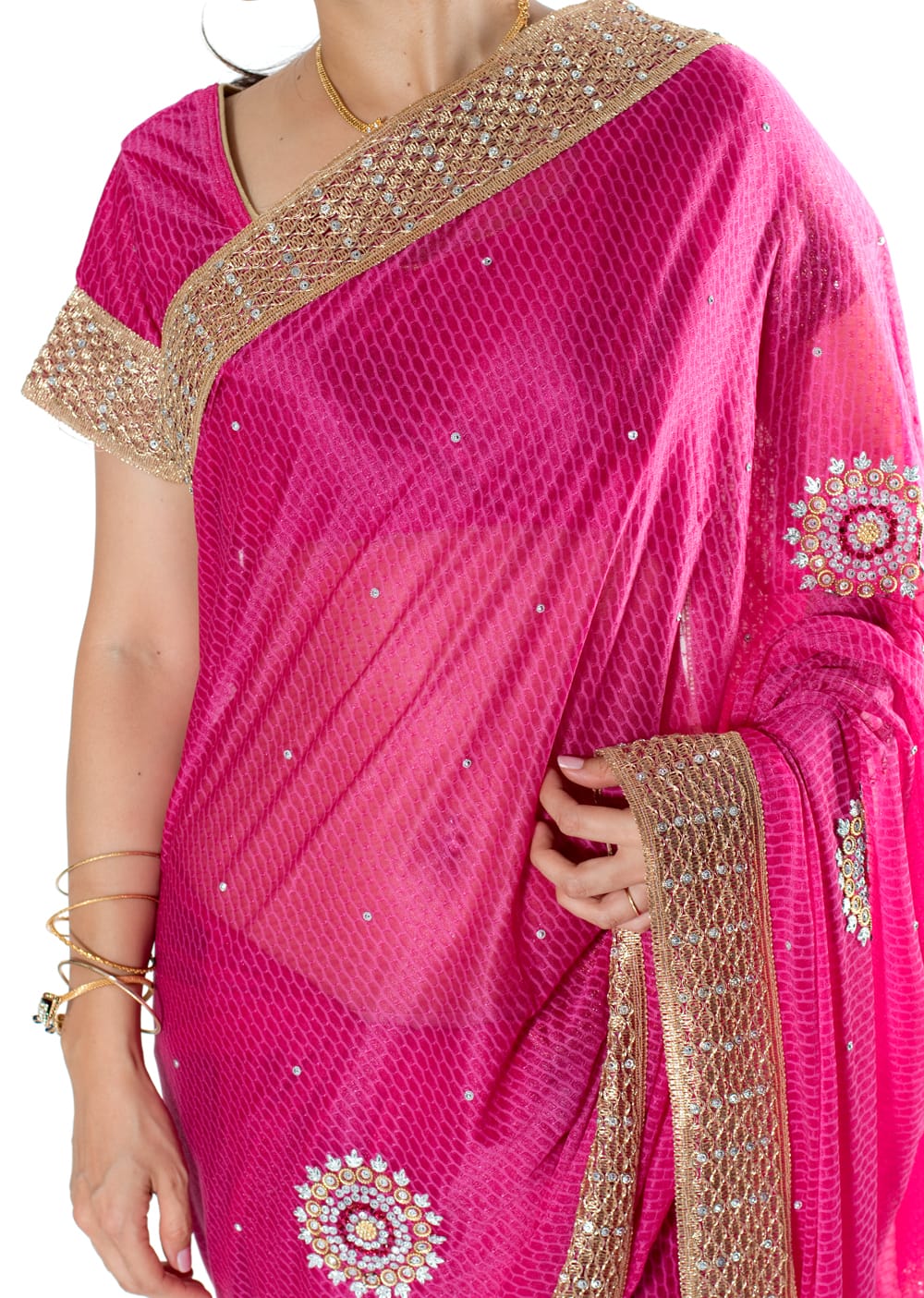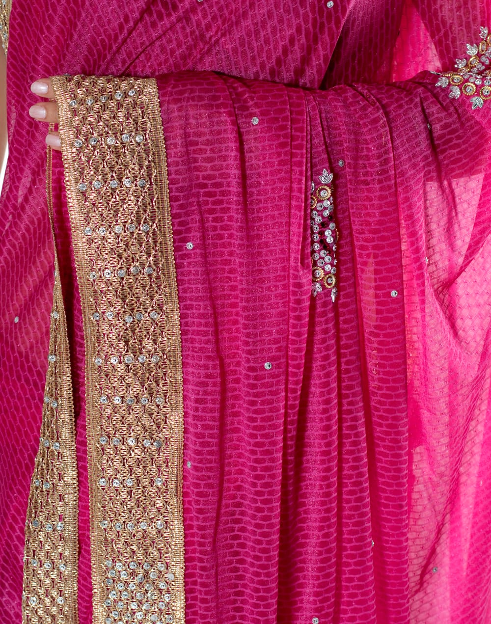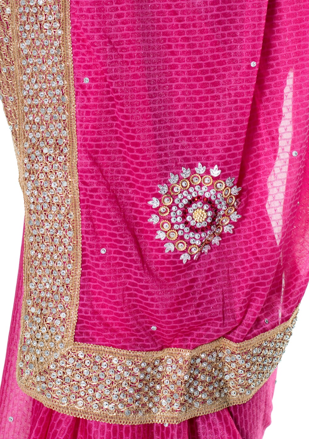 金糸とビーズ刺繍 レンガ模様のマハラニインドサリー【チョリ付き】 - マゼンダ