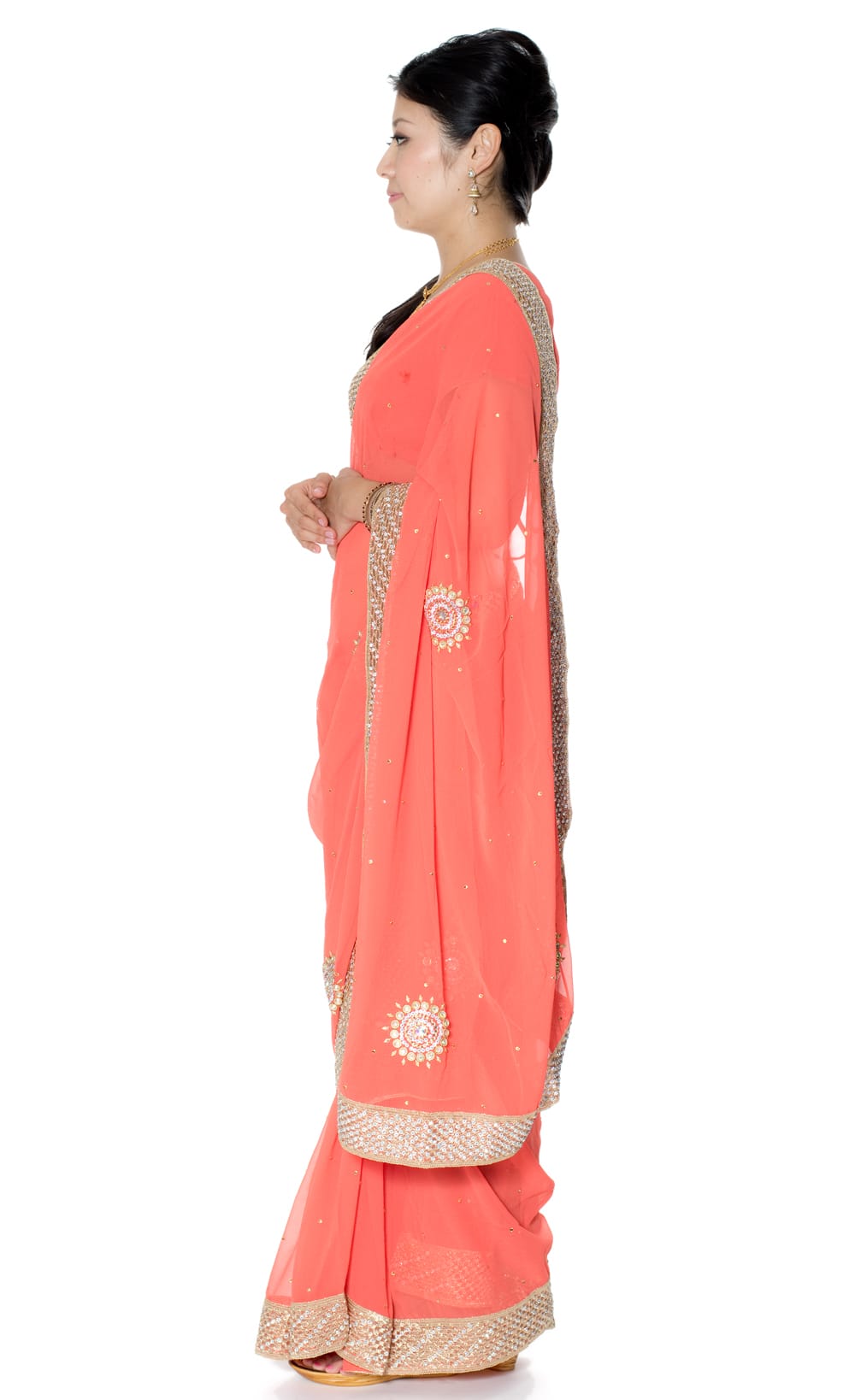 【訳あり】金糸とビーズ刺繍のジョーゼットインドサリー【チョリ付き】 - サーモンピンク 通販店