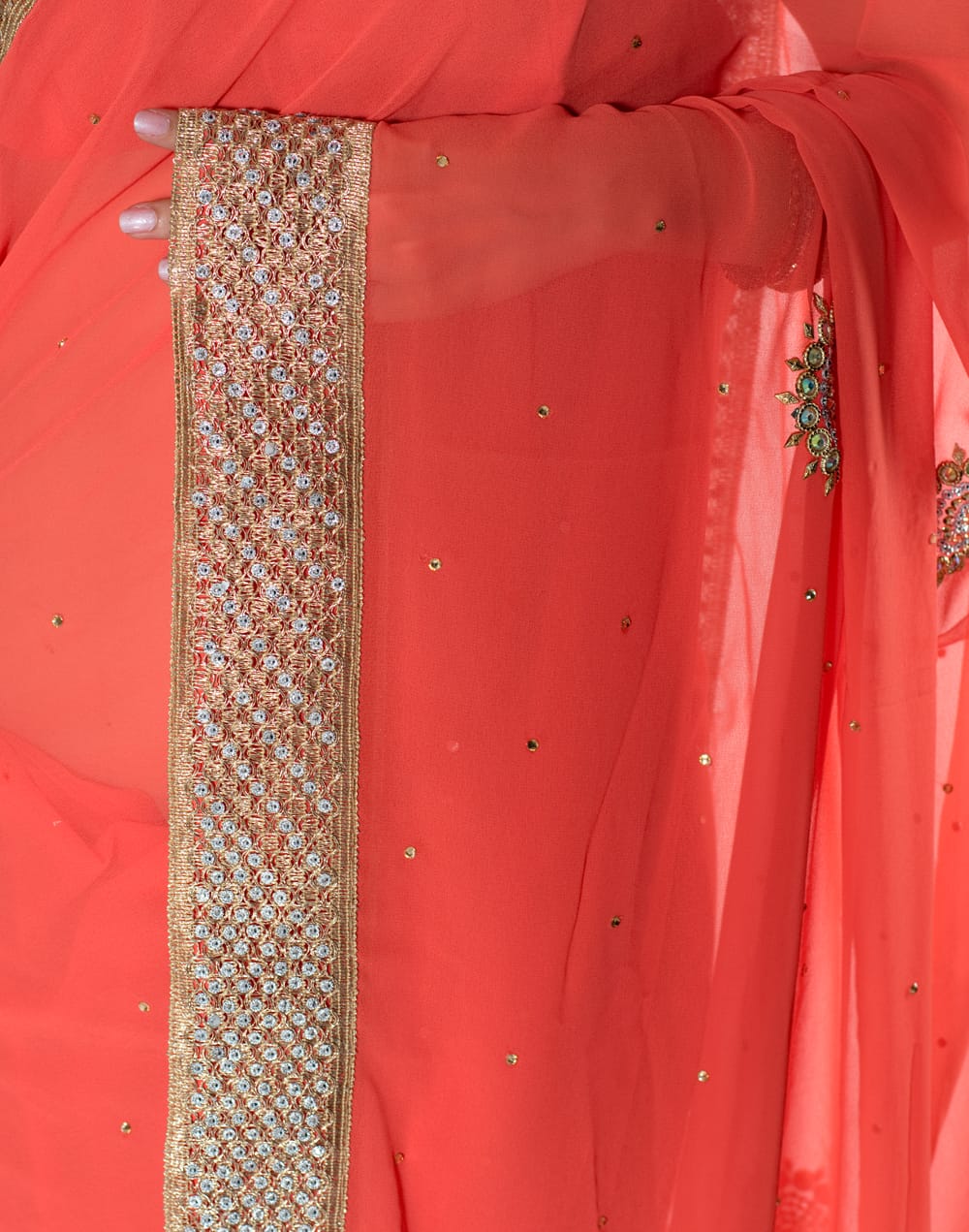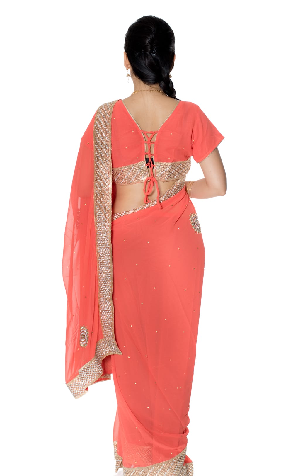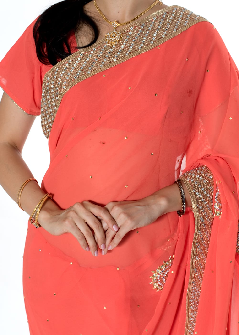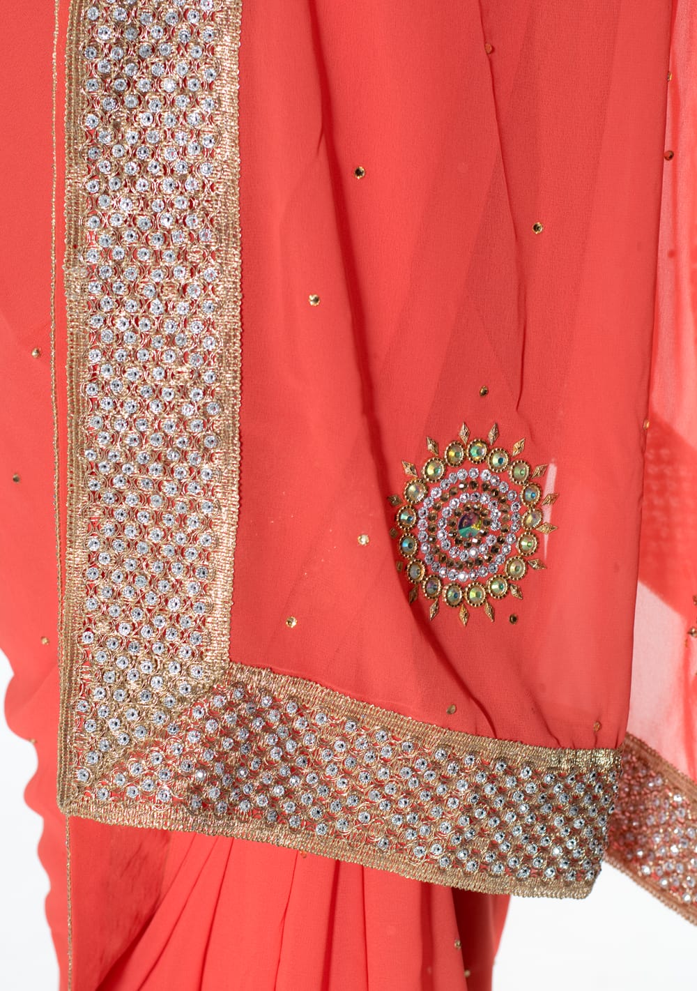 【訳あり】金糸とビーズ刺繍のジョーゼットインドサリー【チョリ付き】 - サーモンピンク