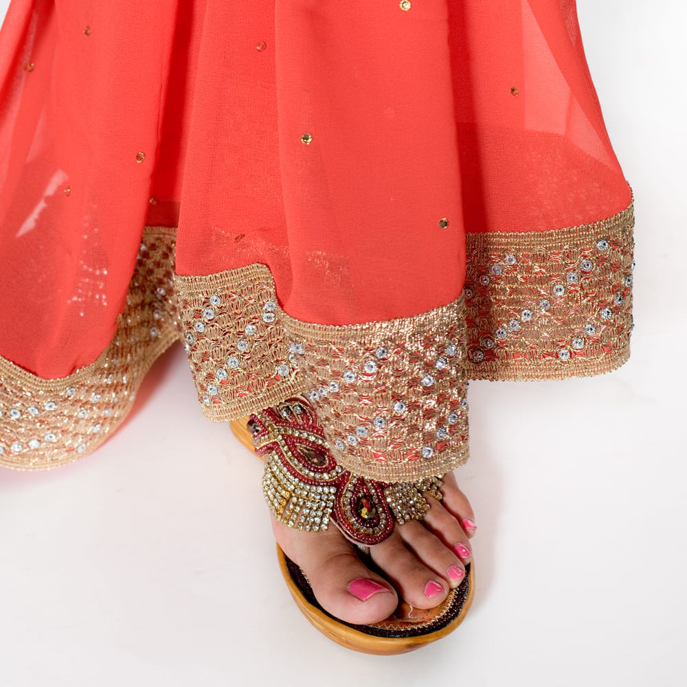 サリーに使われている生地は、薄手で透け感のある人気なジョーゼット生地。ふんわりとした着心地で軽やかです。そんなジョーゼット生地へ、美しいゴージャスな金糸やビーズを装飾。