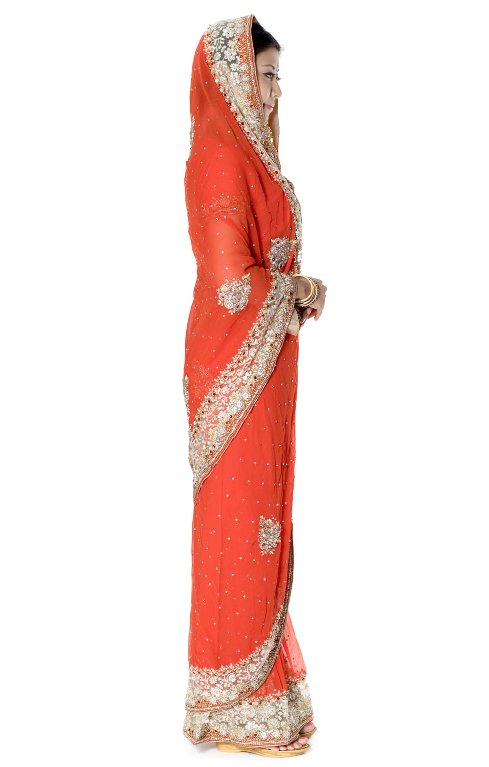 サリーはただの布ですので、完全にフリーサイズ。巻きの長さの調整をして頂ければ、安心してお楽しみ頂けます。【一点物】刺繍とビジューの婚礼用ゴージャス ジョーゼットサリー【チョリ付き】 - オレンジの類似商品