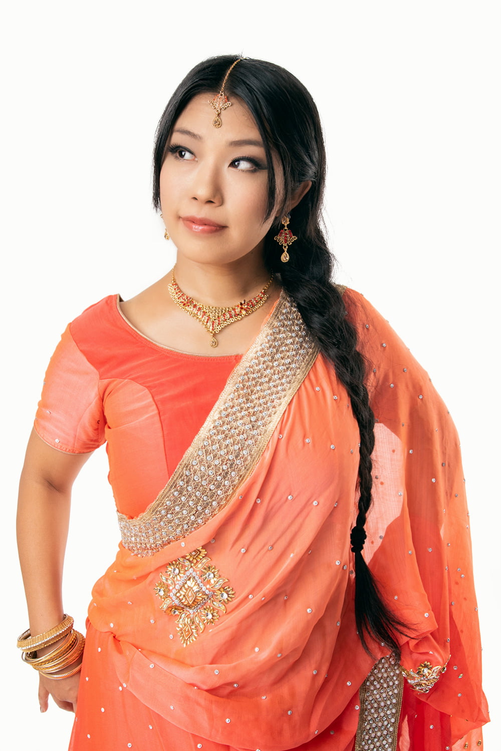 サリーはただの布ですので、完全にフリーサイズ。巻きの長さの調整をして頂ければ、安心してお楽しみ頂けます。刺繍とビジューのグラデーション サリー【チョリ付き】の類似商品