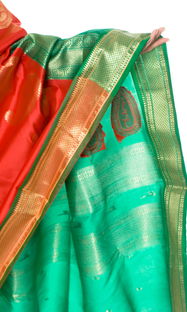 ベナレスのインドサリー【ライン・光沢】 赤×緑