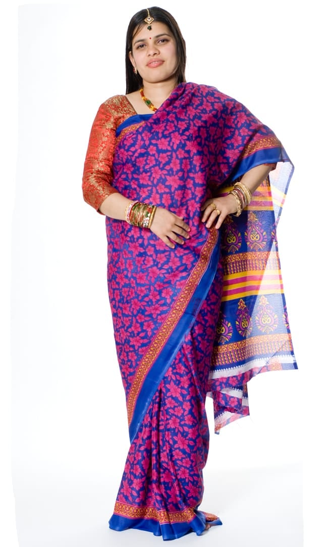 インドサリー【花・ペイズリー】 全4色の商品写真 1枚目 このサリーを実際に着用するとこんな感じになります。チョリは別売りになりますので、別途ご用意ください。