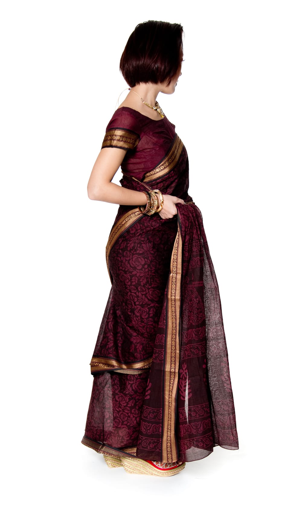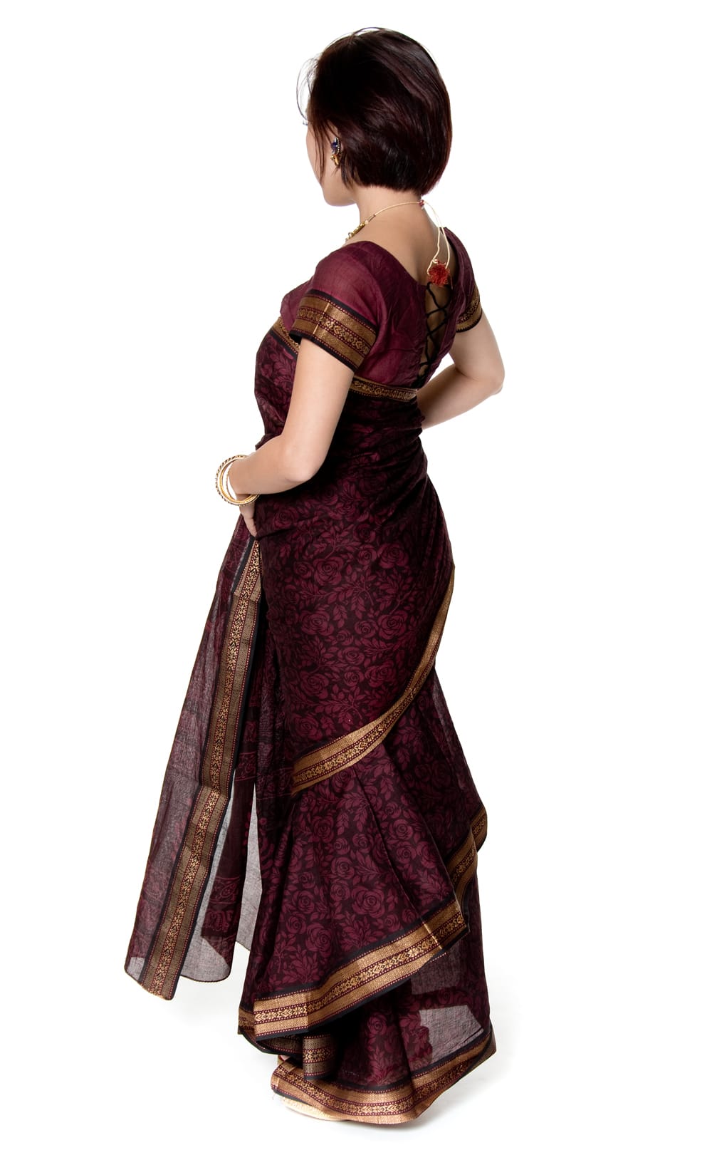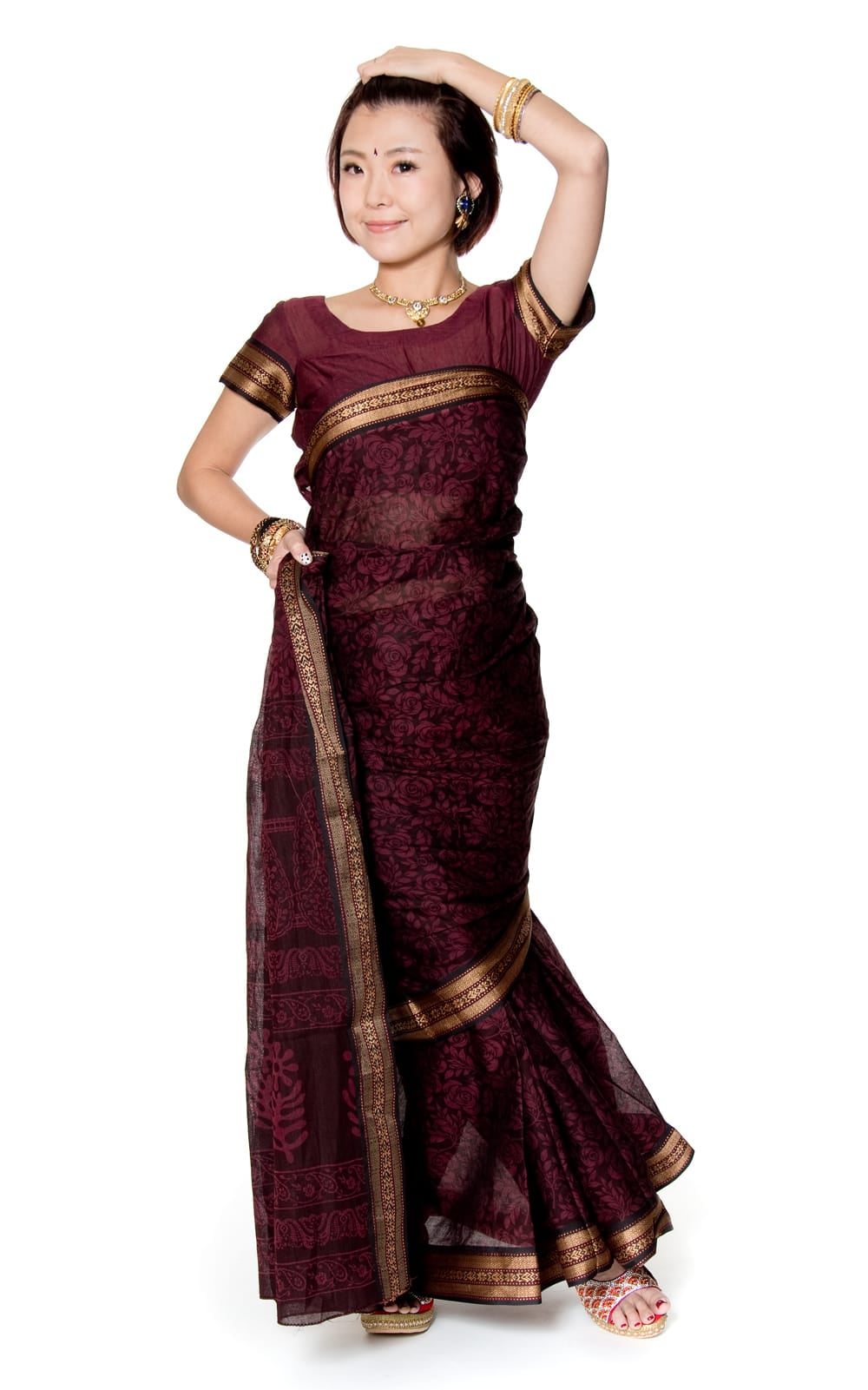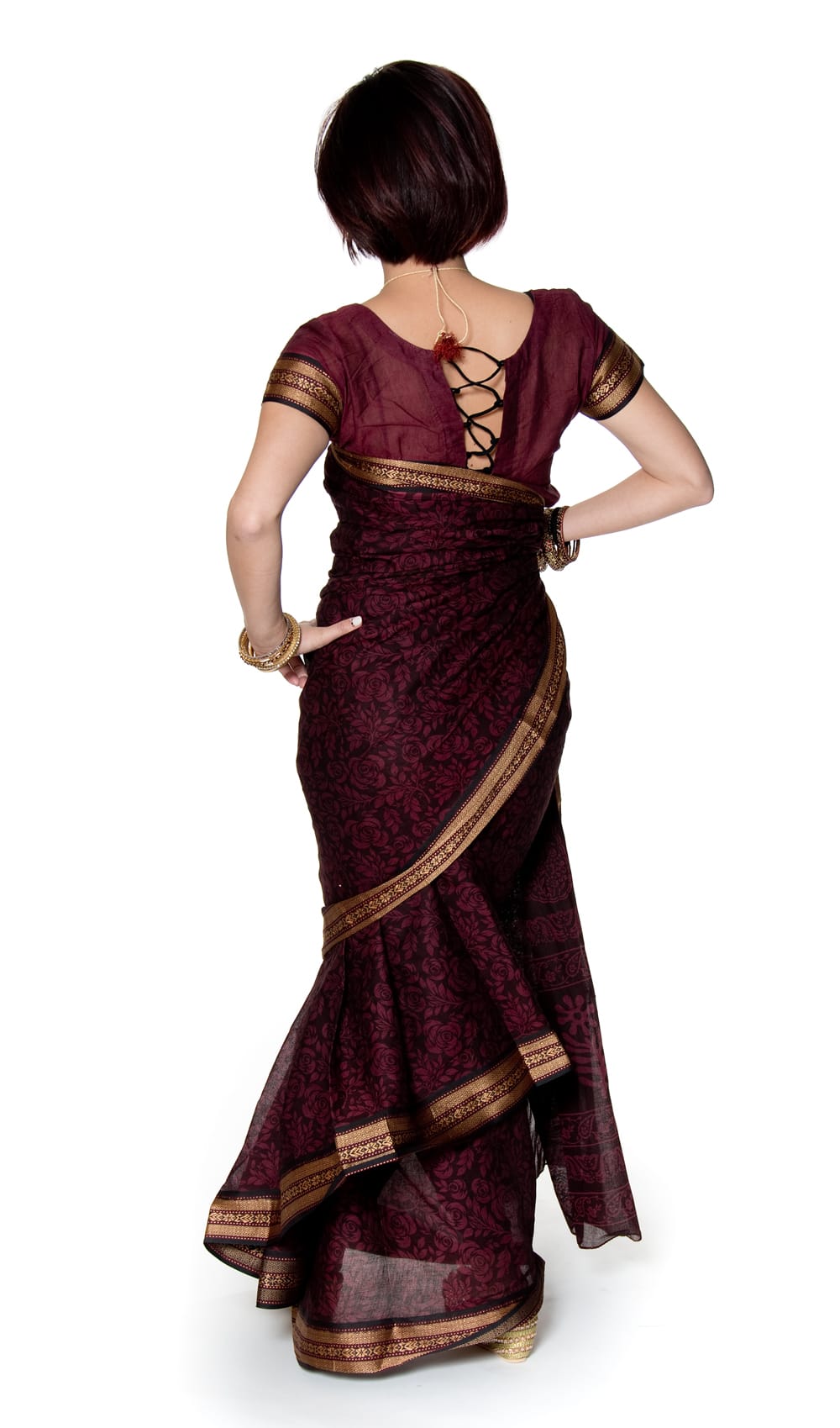 こちらのサリーには、モデルさんがサリーの下に着用しているチョリも付属。同じ風合いの生地で作られているので、サリーにも似合います。