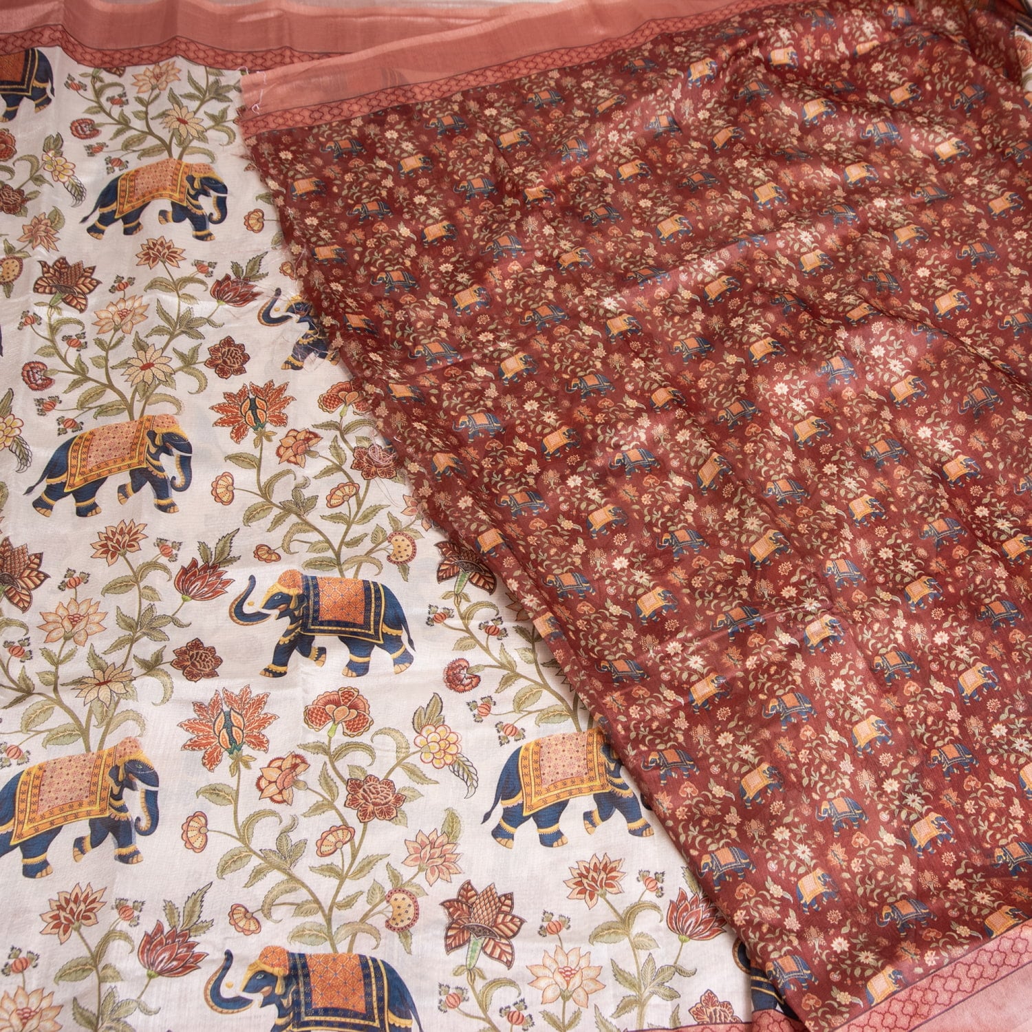 ムガル風 レトロ調 アニマル×ボタニカルプリントサリー