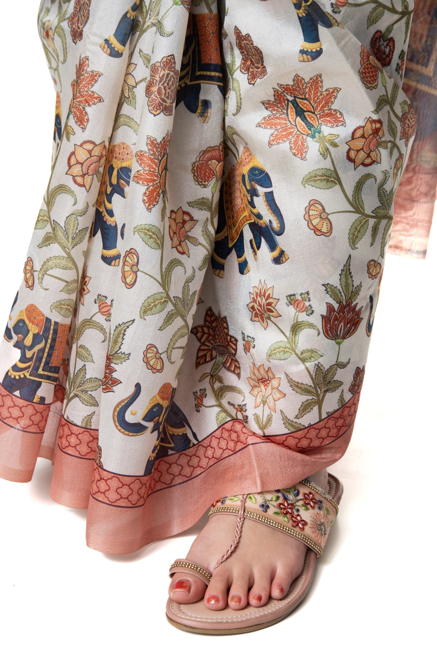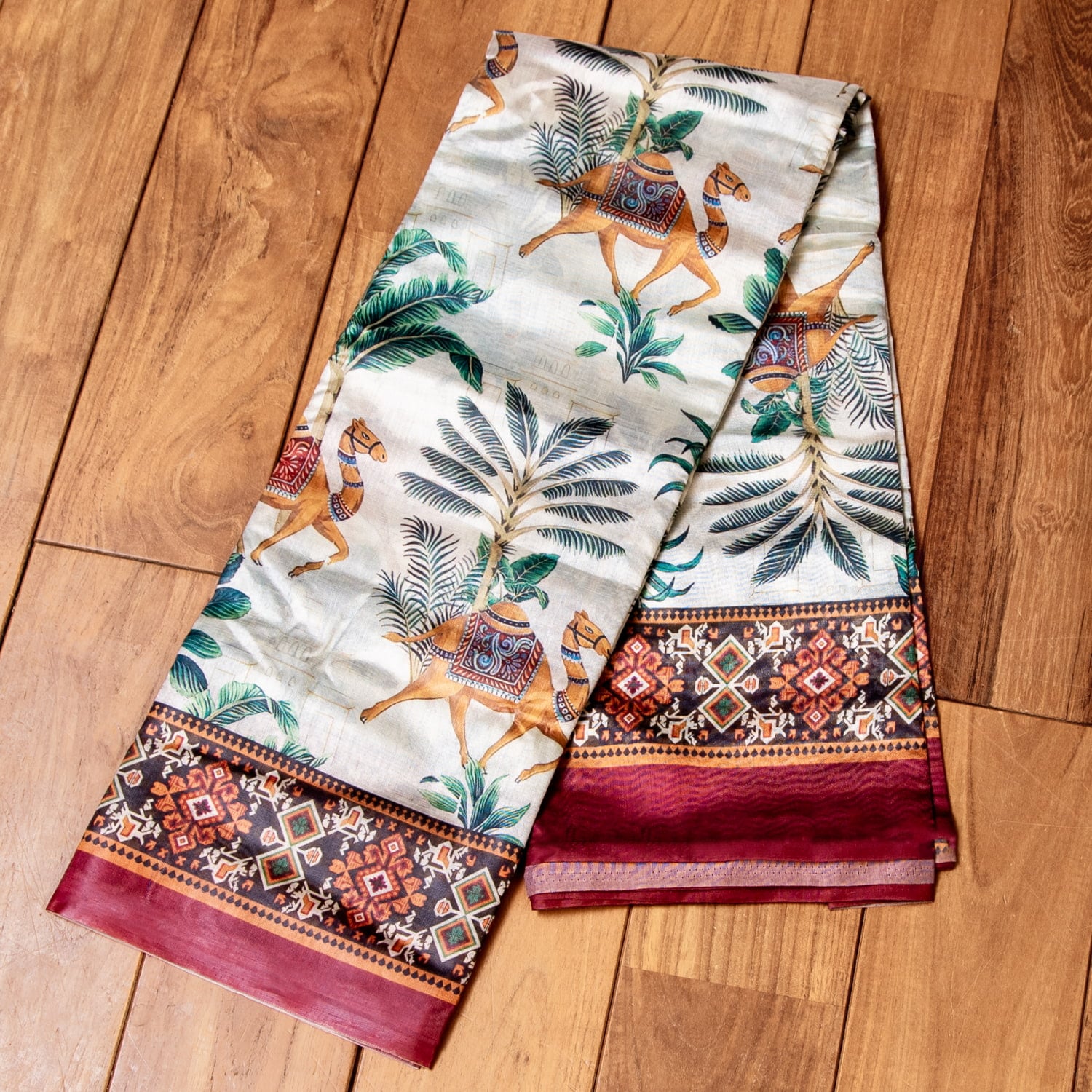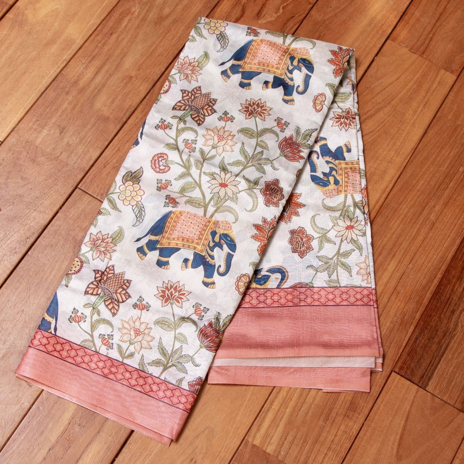 なんとも可愛らしい、レトロでエキゾチックな雰囲気たっぷりのボタニカルプリントのサリーがやってきました!正統派な伝統模様だけではなく、現代のおしゃれな女性に向けて、こんなデザインのサリーも作られているのですね。ゾウやラクダ、聖なる牛などのインドらしい動物たちがふんだんに描かれた世界。ベースはホワイトやグリーンなど落ち着いたシックな印象ながらも、そこに溢れる鮮やかな色柄が楽しく、見ていて飽きないデザインです。肩から垂れ下がる部分(Pallu)は、まさに絵画作品のような美しさですね。
