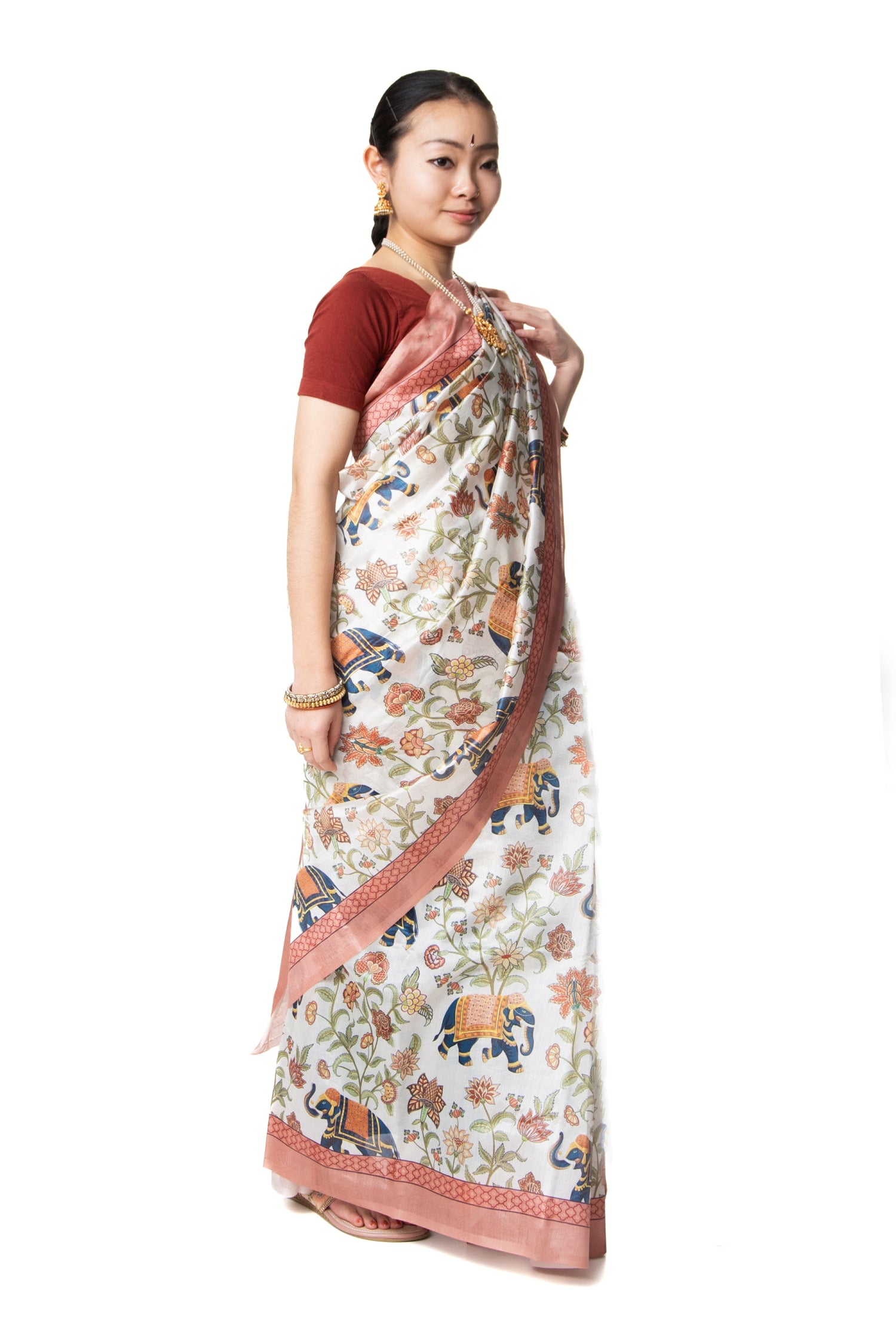 初めてのサリーをイベント用に購入しました。色柄ともにとてもこのお値段には見えません。落ちた赤でとても品よく着用出来ます。軽くて着やすいので次はコットンサリーの購入を考えています。