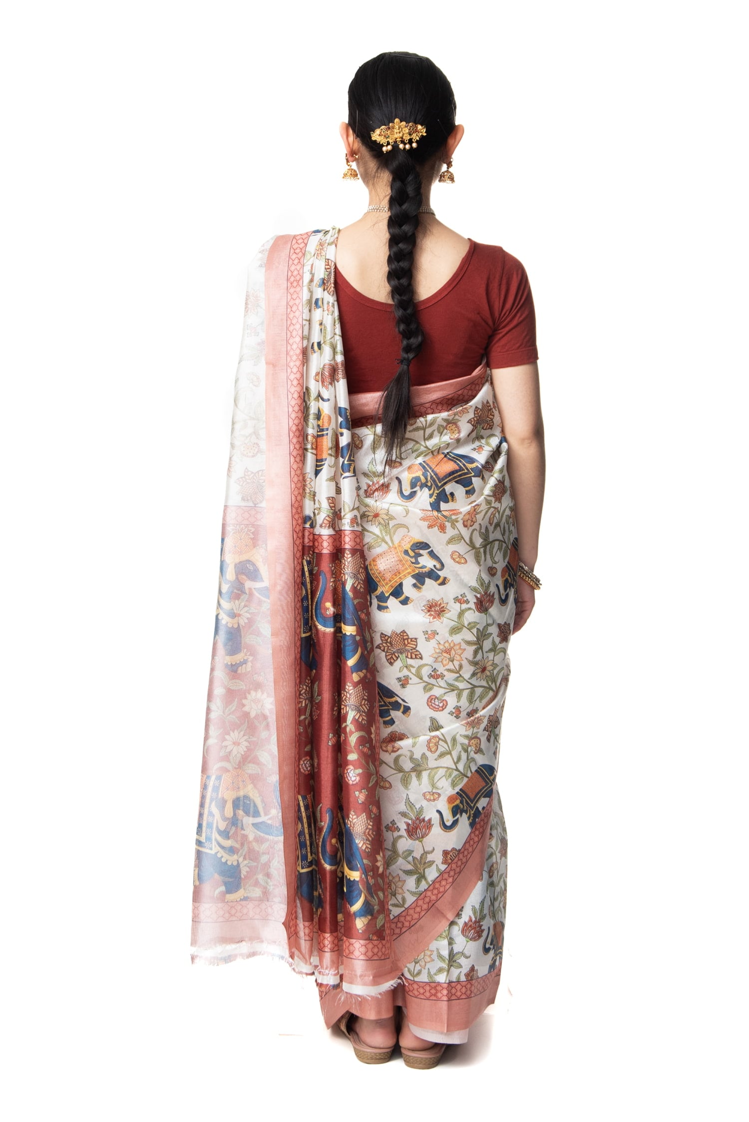 サリーの着方を片手に試しに着てみたところ、何とか形になりました。練習すればもっと上手に着られそうです。