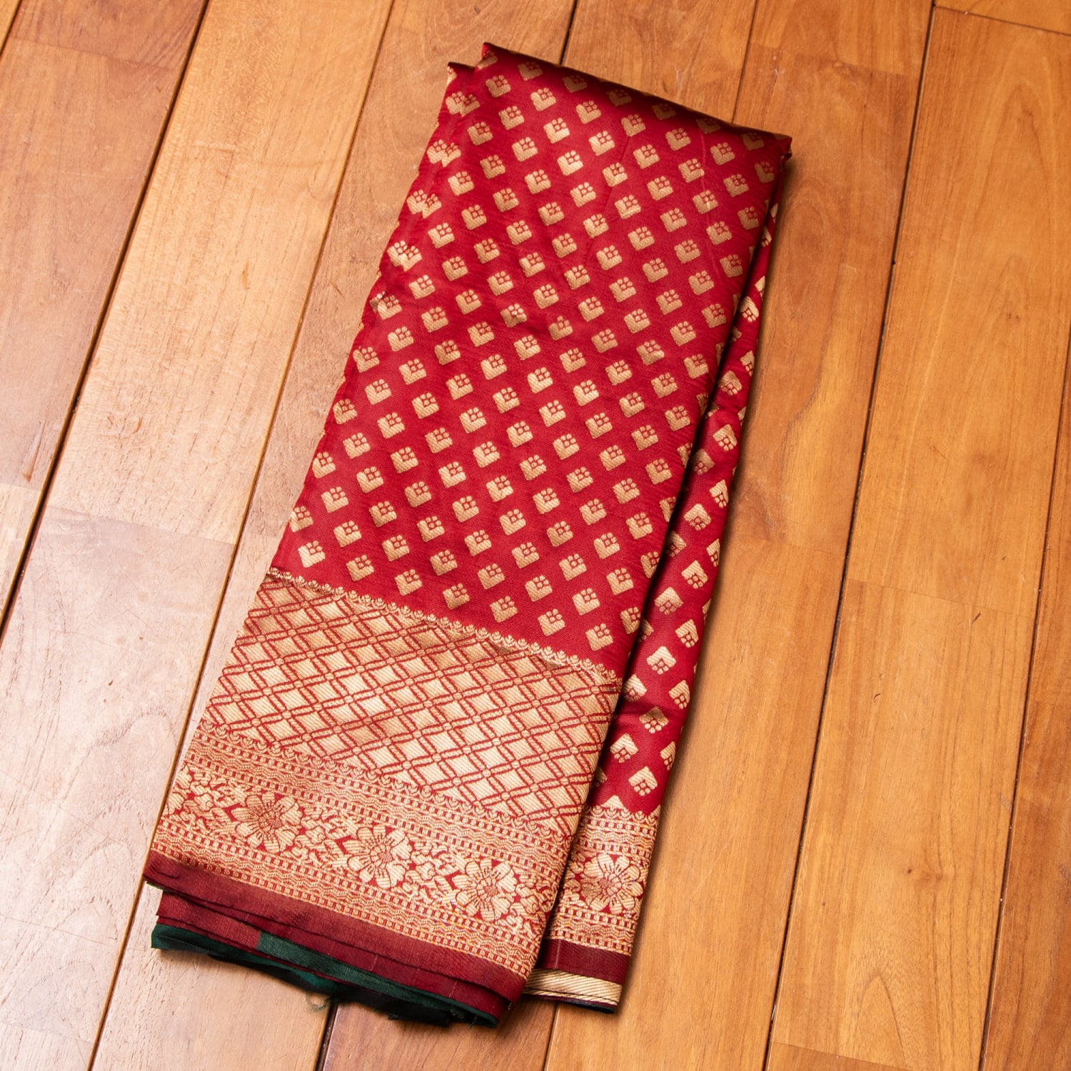 初めてのサリーをイベント用に購入しました。色柄ともにとてもこのお値段には見えません。落ちた赤でとても品よく着用出来ます。軽くて着やすいので次はコットンサリーの購入を考えています。