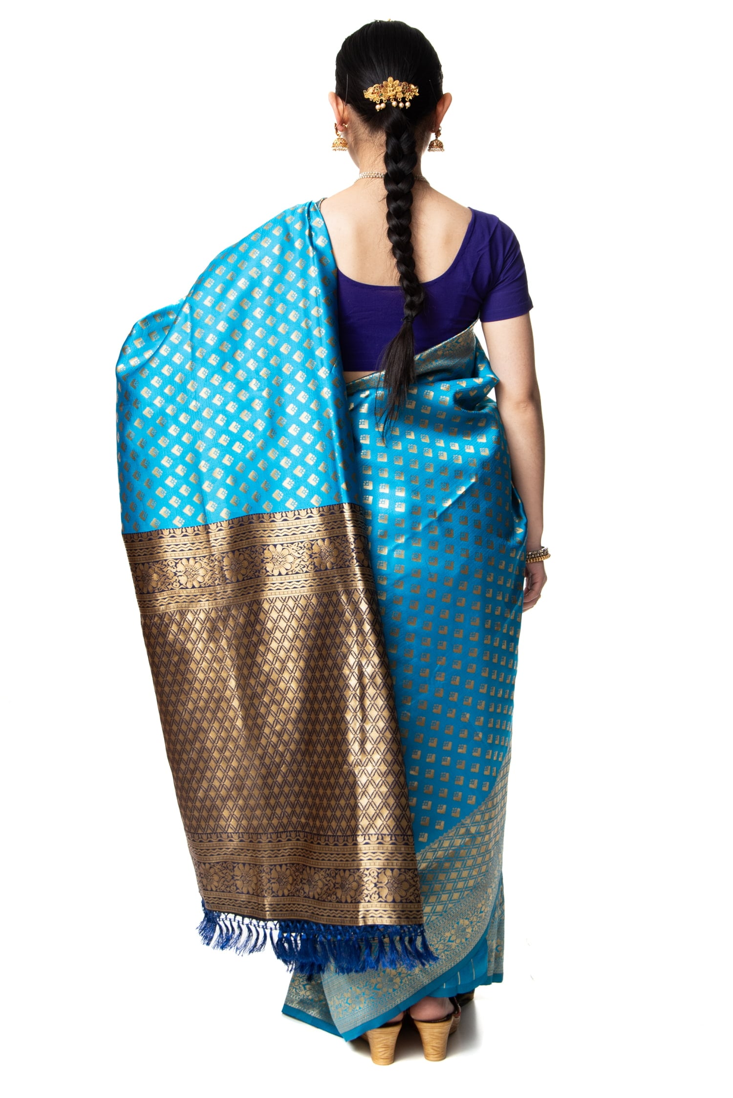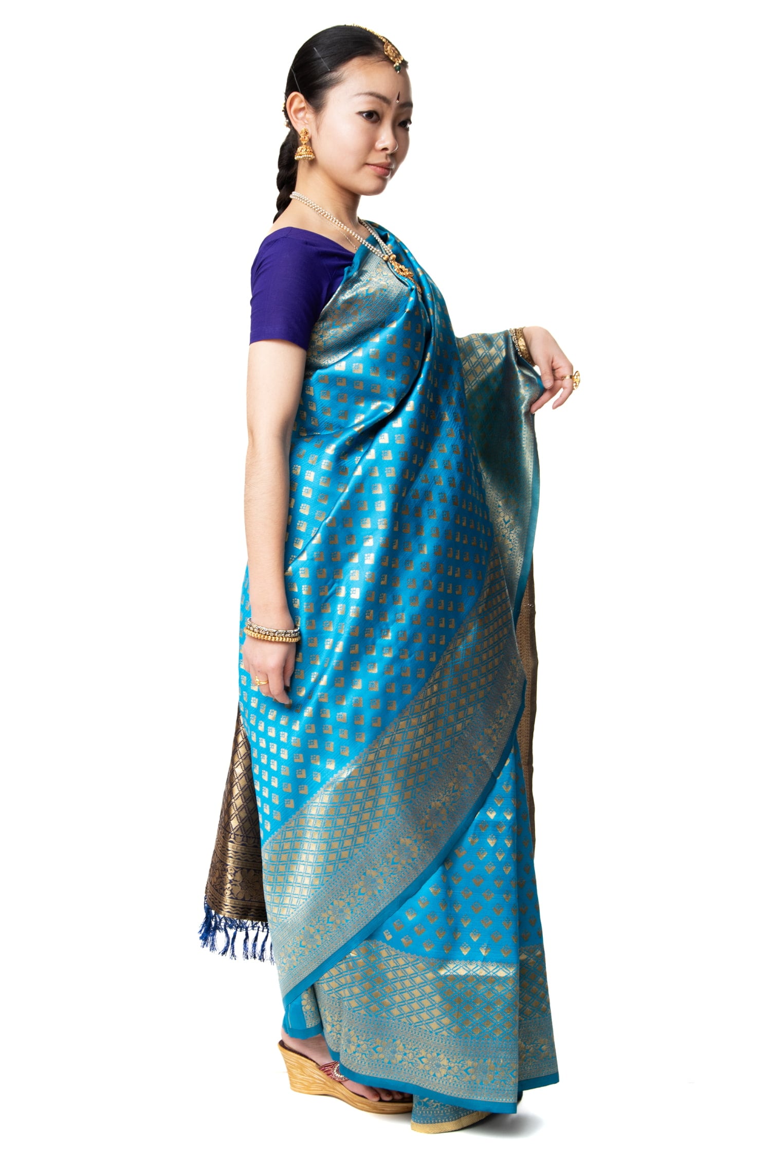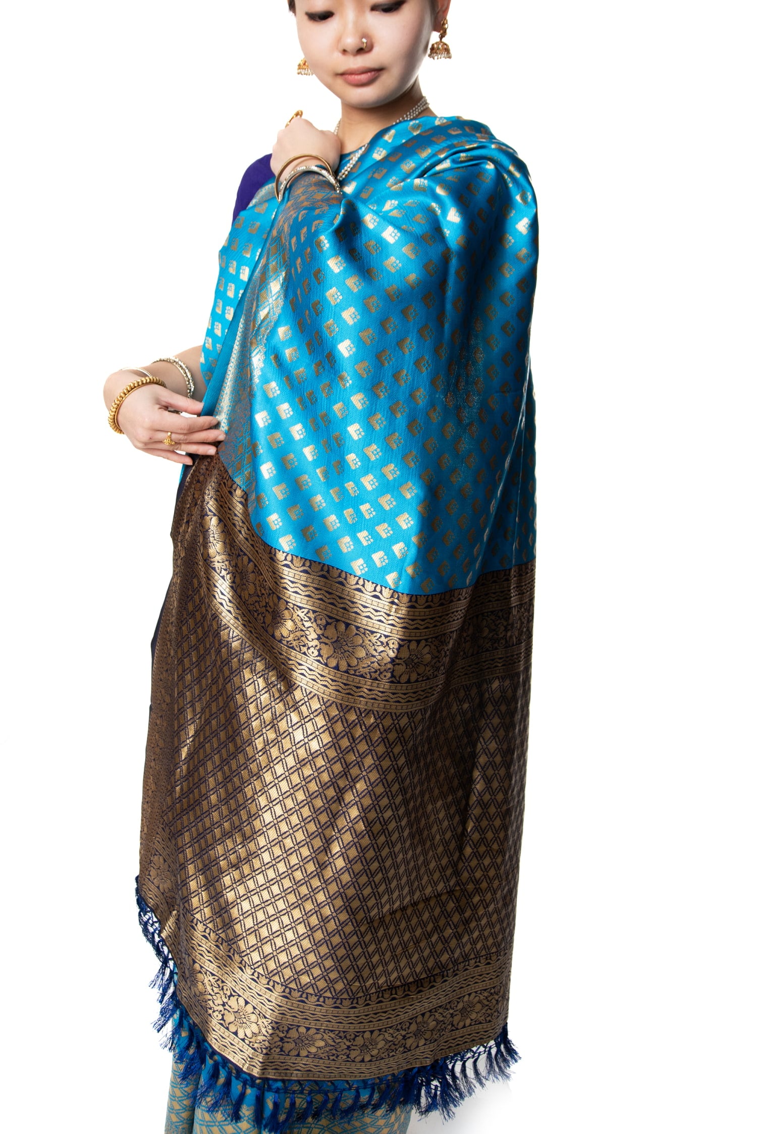 色とりどりのサテン素材で織られたこちらのサリーは、金糸をふんだんに使った光り輝くゴージャス仕様。まるでインド映画のヒロインや、王族役の方が身につけていそうな存在感です。しっかりとした厚みがあり、柔らかく体に沿う光沢素材。初めての方でも巻きやすく、着崩れしにくいのも嬉しいポイントです。ボディの色と、肩から垂れ下がる部分(Pallu)の色が素敵なコントラストを成しています。