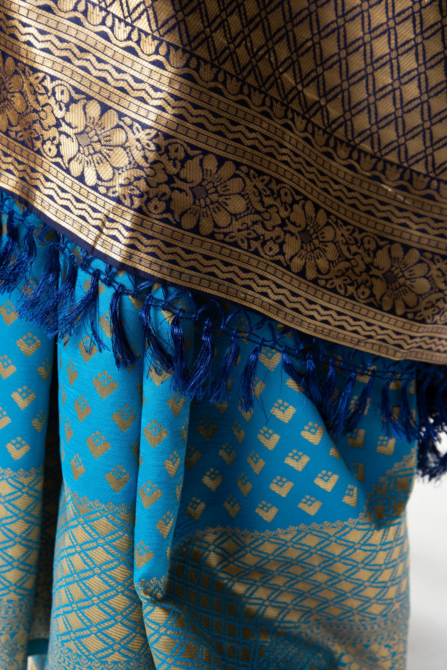 垂れ先は通常のサリーだと切りっぱなしのことが多いのですが、こちらのサリーは豪華なフリンジ仕上げになっています。