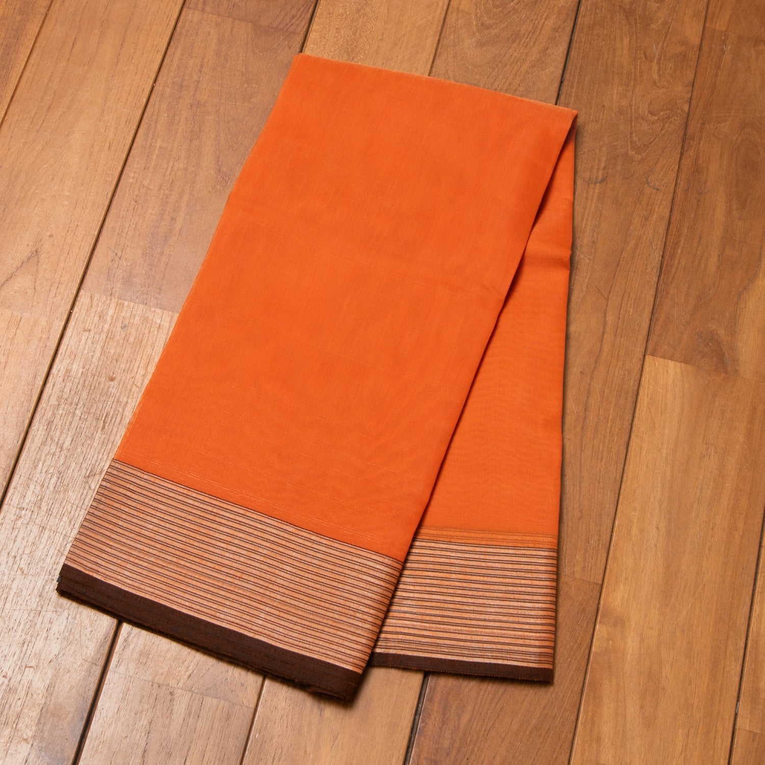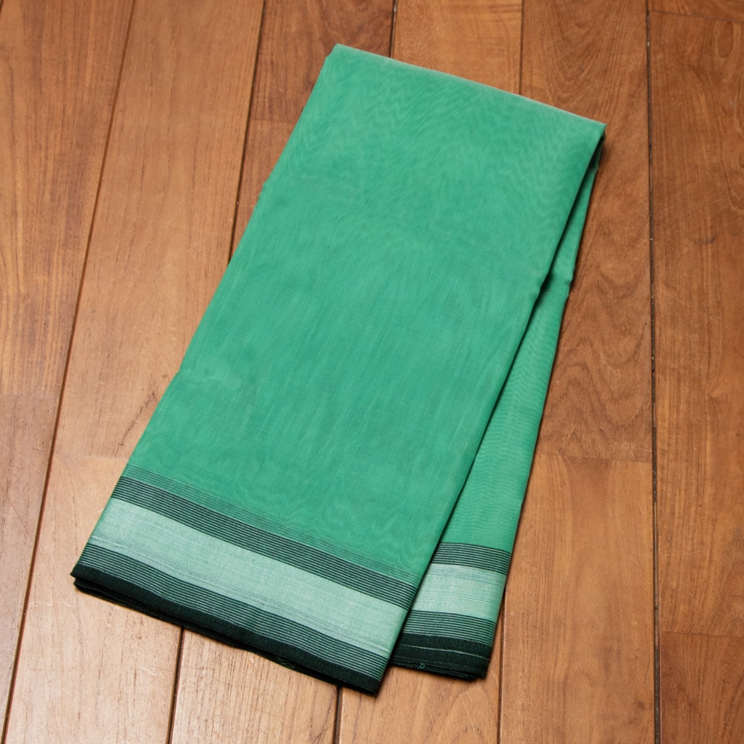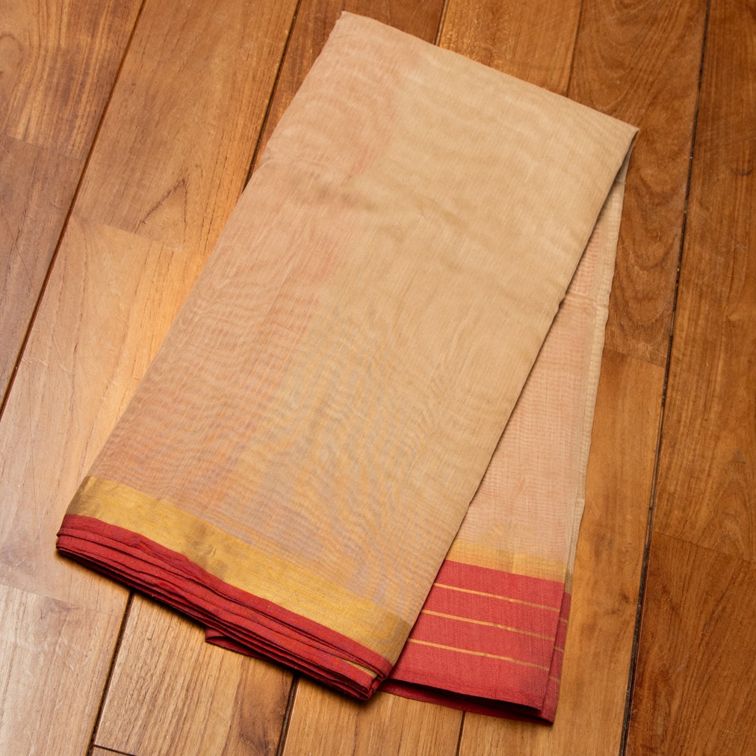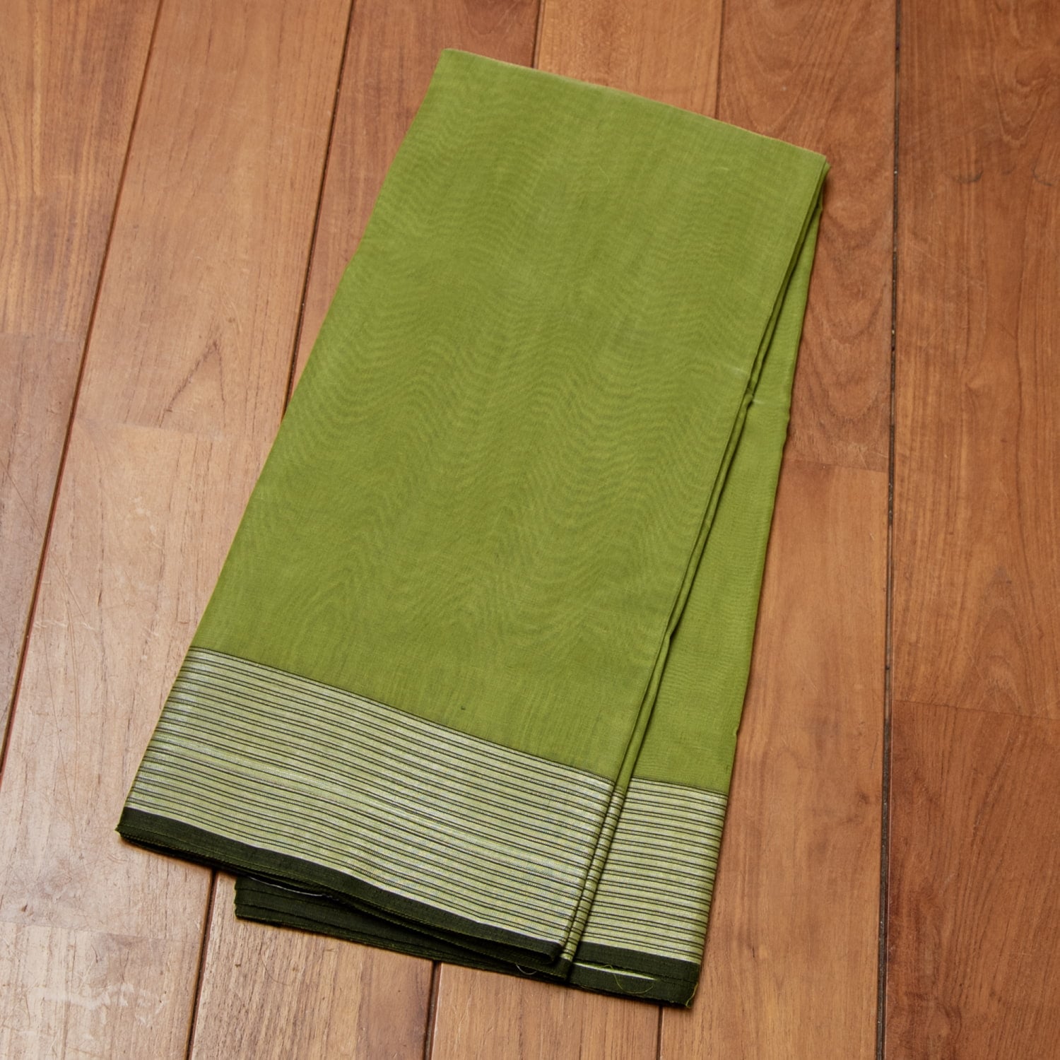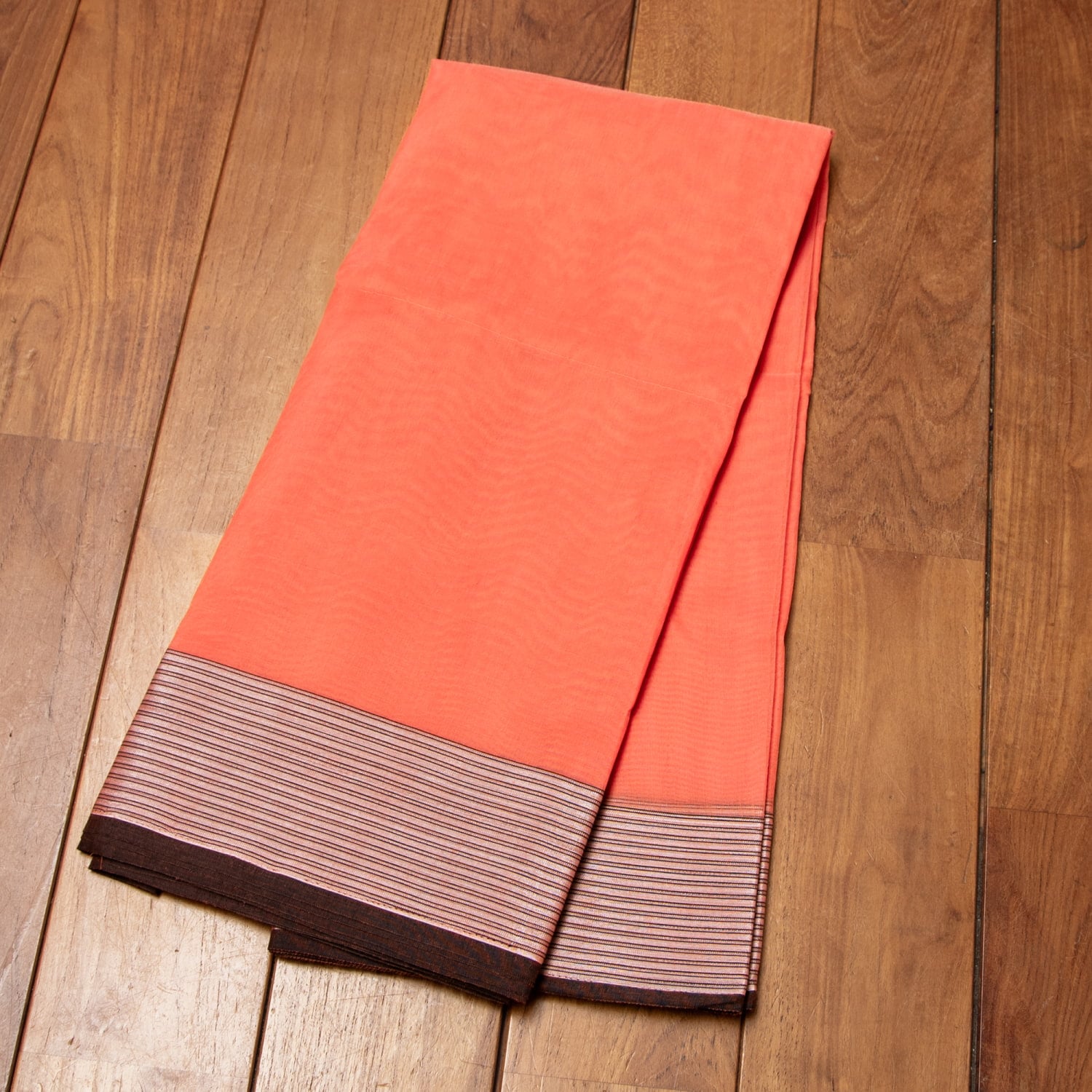 こちらのサリーはプレーンなボディに、幅広のボーダー柄があしらわれたシンプルかつモダンなデザイン。日常に寄り添う飾らなさがありつつも、薄いコットン生地本来の色味と陰影の美しさが際立ちます。さらりとした着心地と、肌なじみのよいカラーは普段使いにもぴったり。幅広ボーダーの部分が全体の印象を引き締め、おしゃれ感をアップさせます。