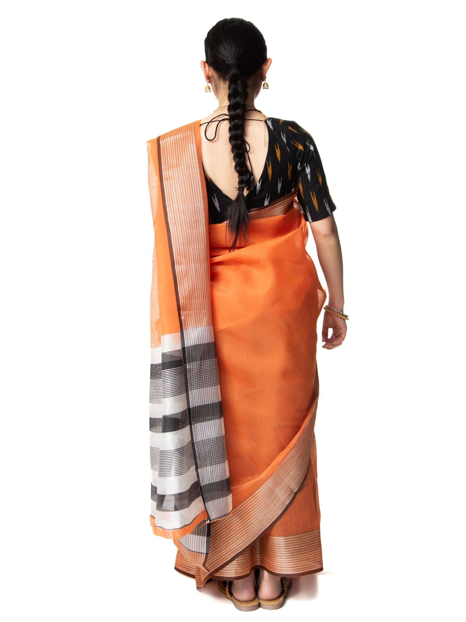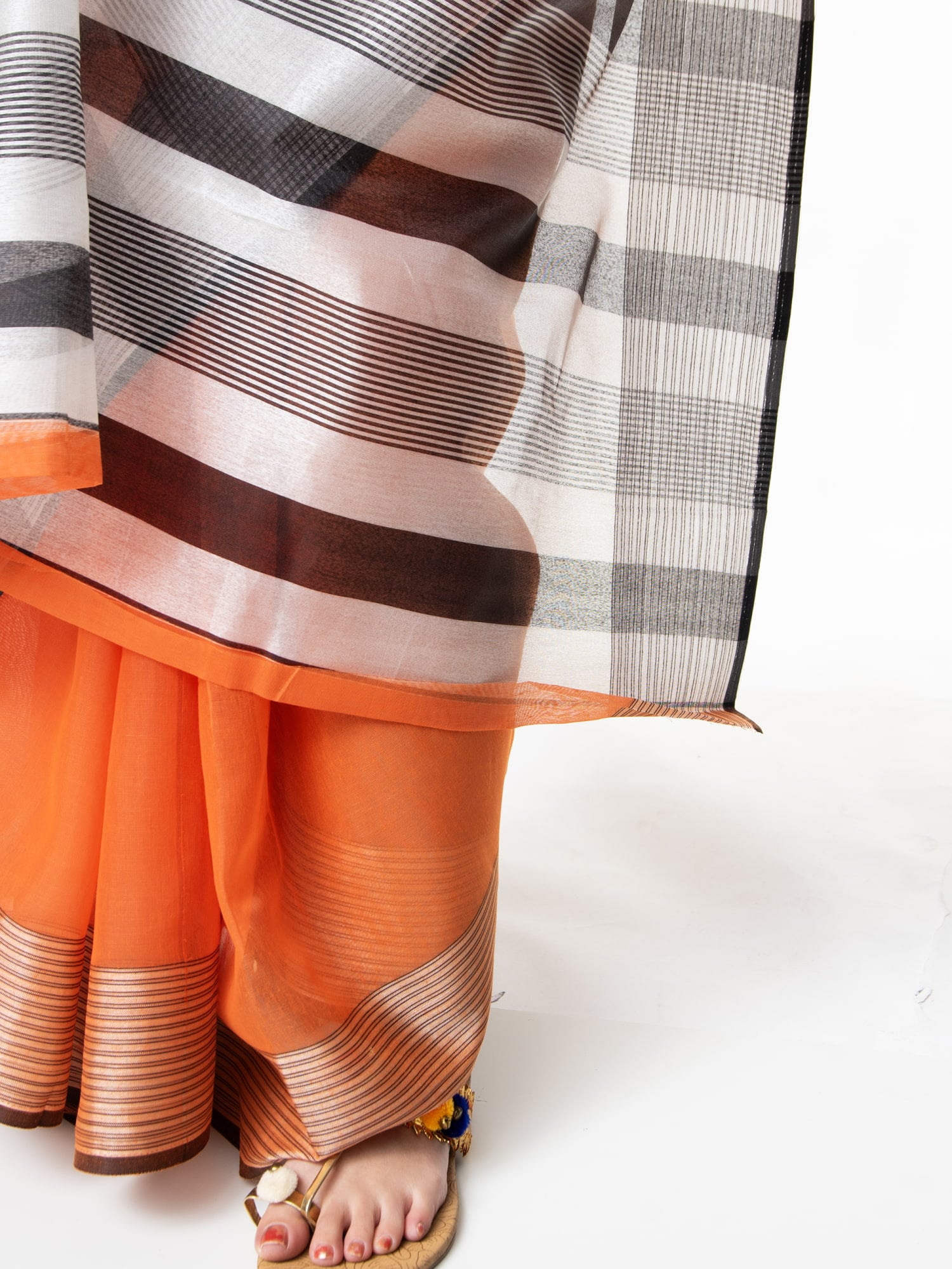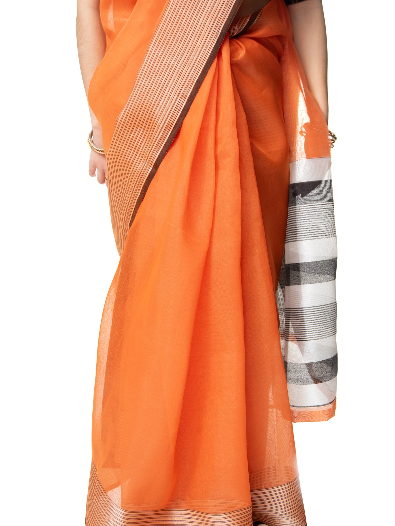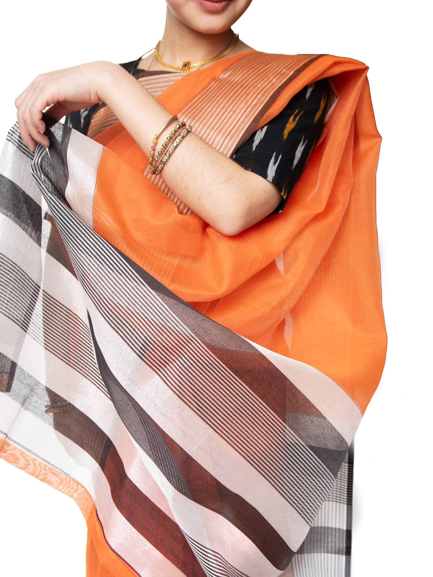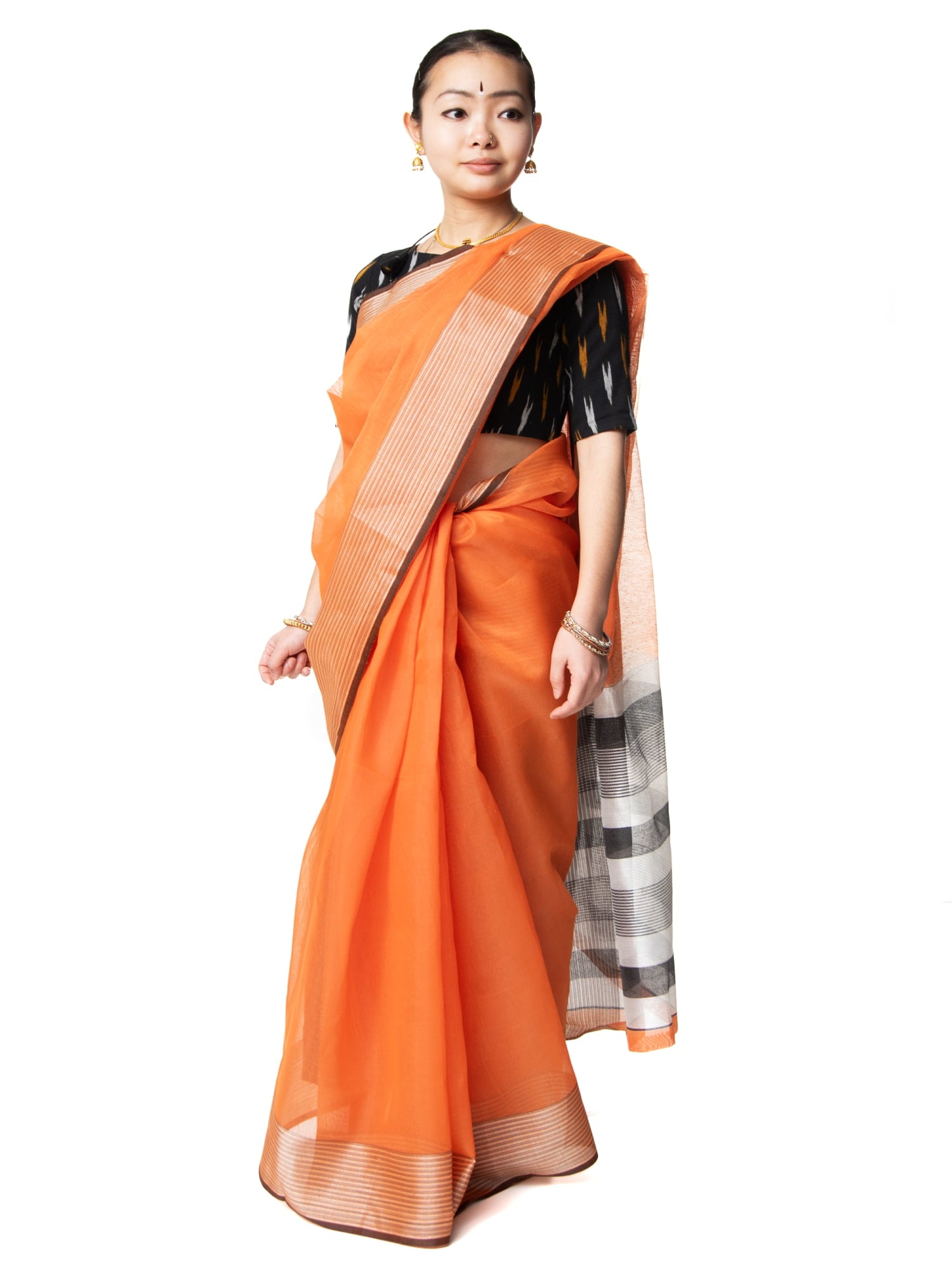 こちらのサリーはプレーンなボディに、幅広のボーダー柄があしらわれたシンプルかつモダンなデザイン。日常に寄り添う飾らなさがありつつも、薄いコットン生地本来の色味と陰影の美しさが際立ちます。さらりとした着心地と、肌なじみのよいカラーは普段使いにもぴったり。幅広ボーダーの部分が全体の印象を引き締め、おしゃれ感をアップさせます。