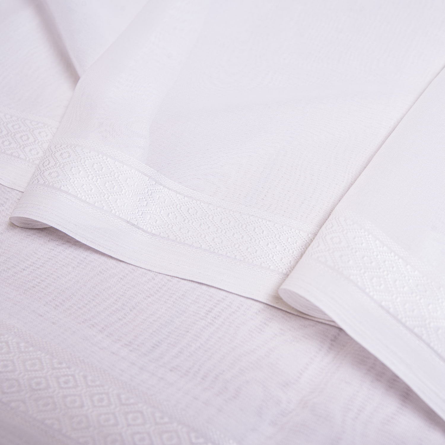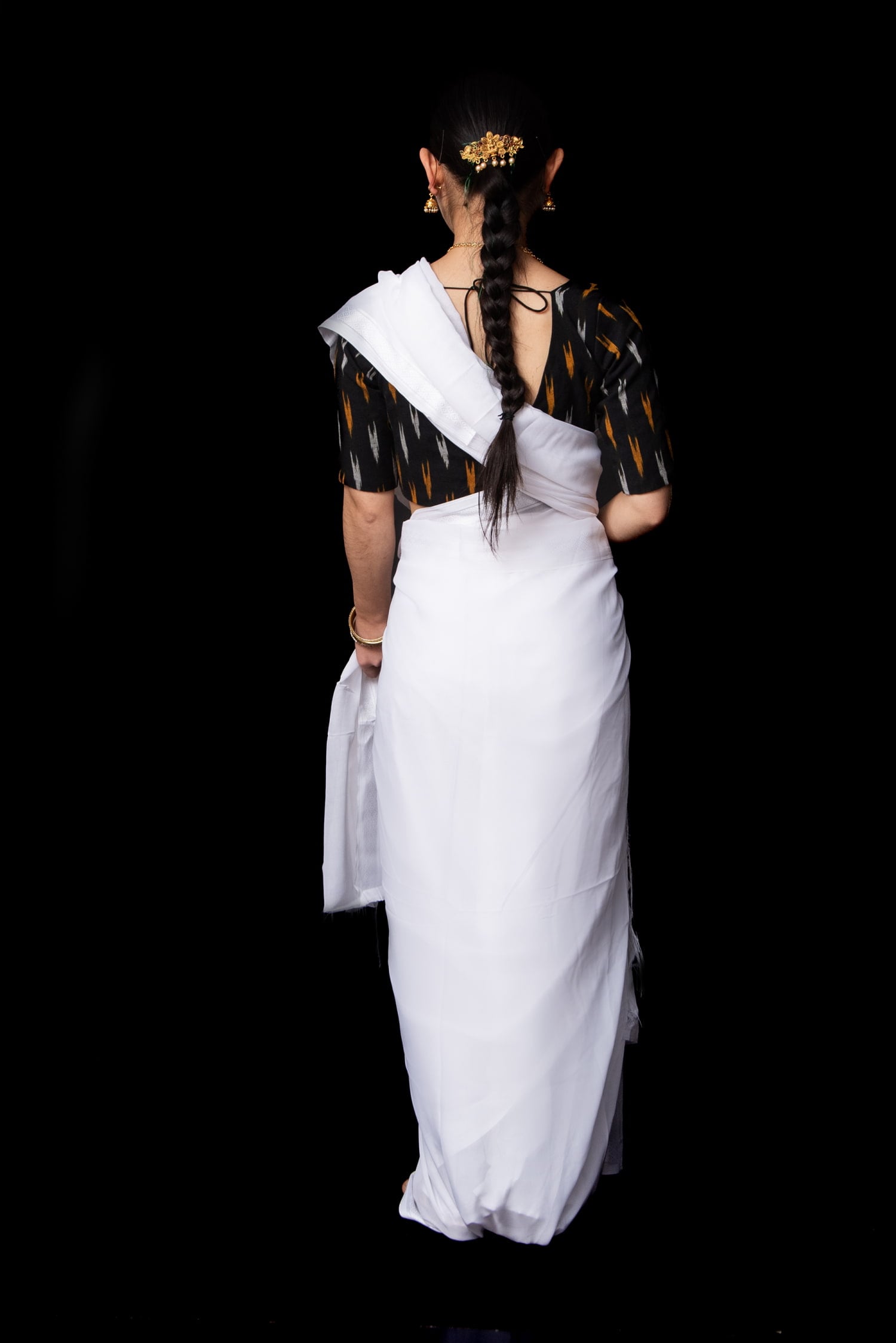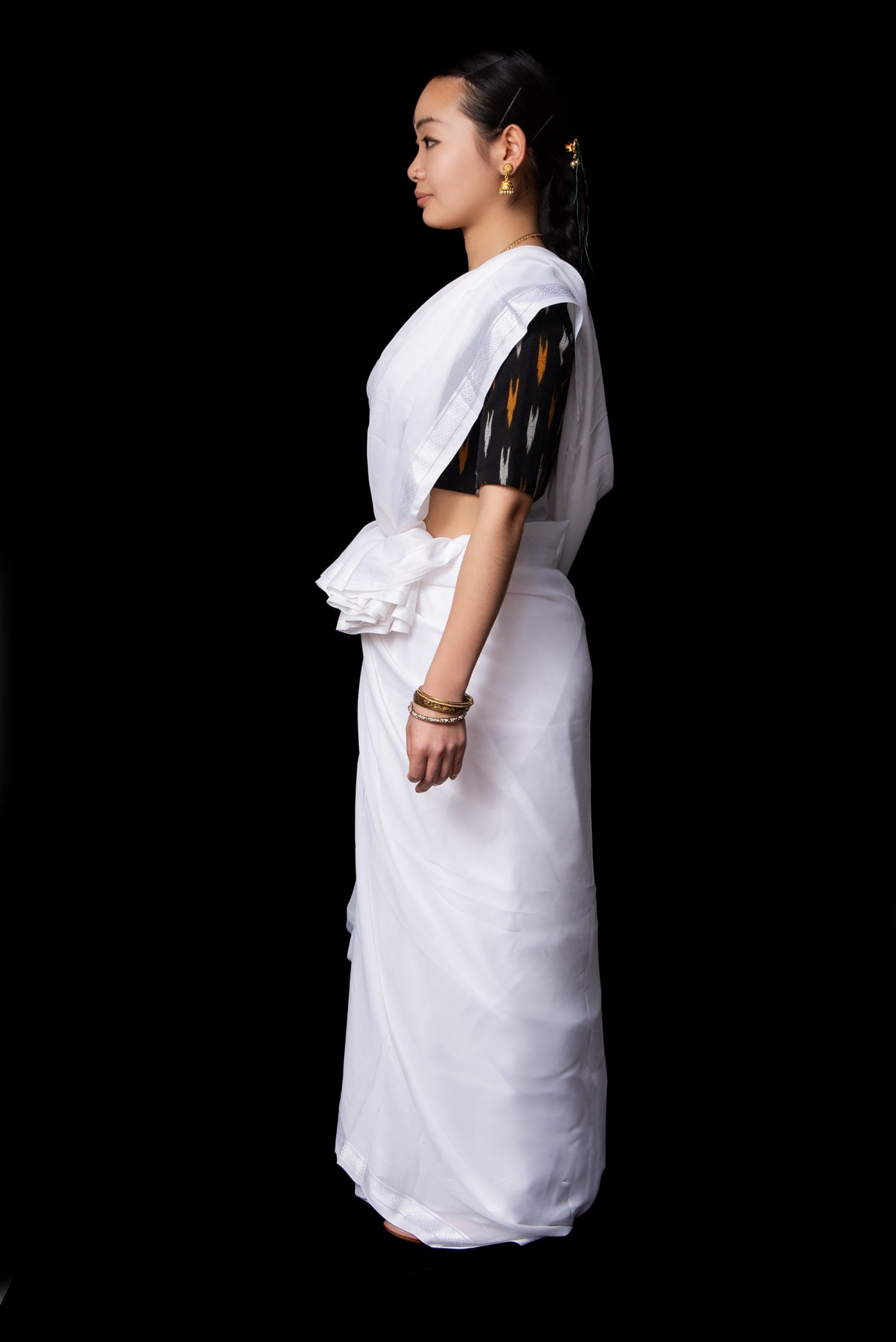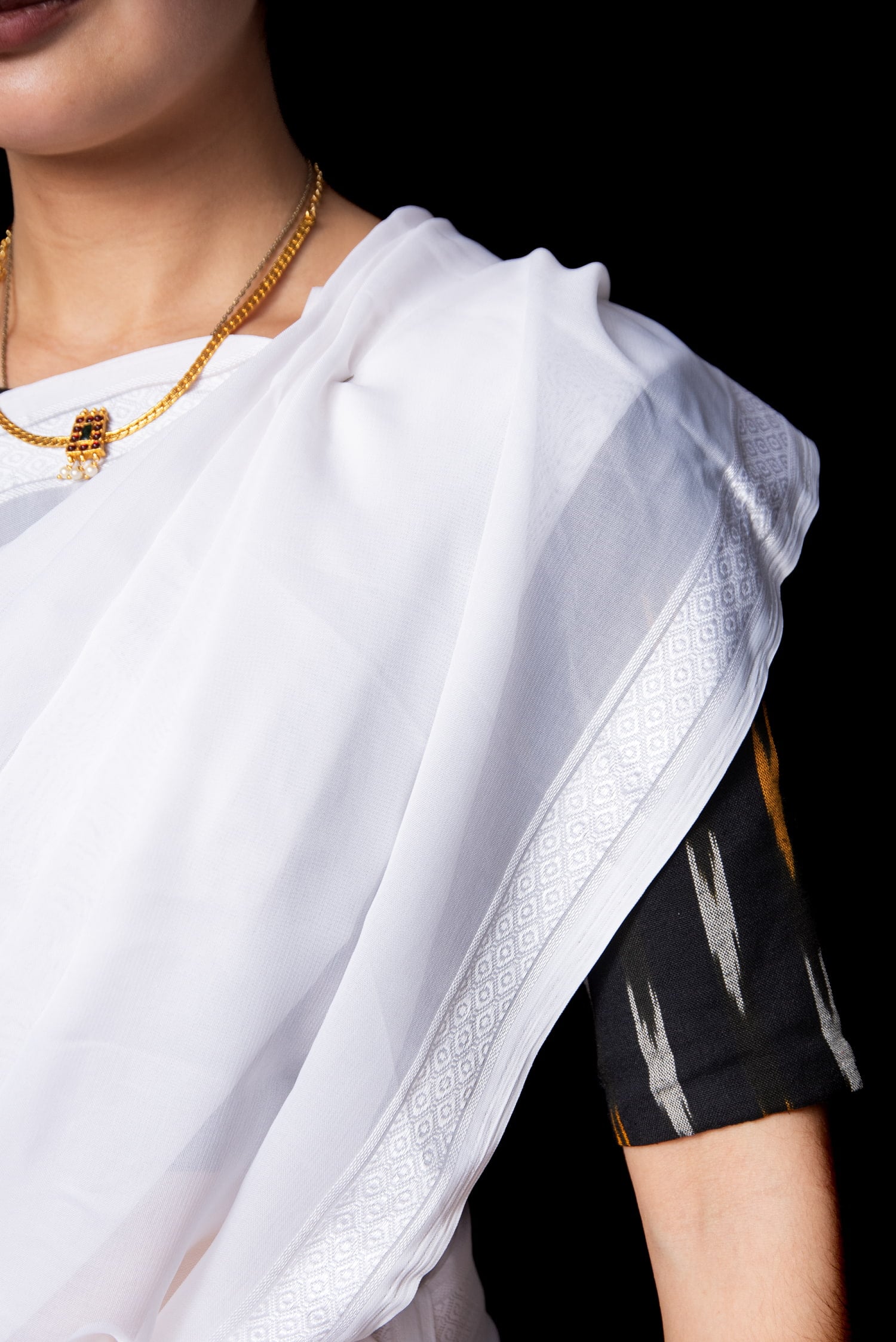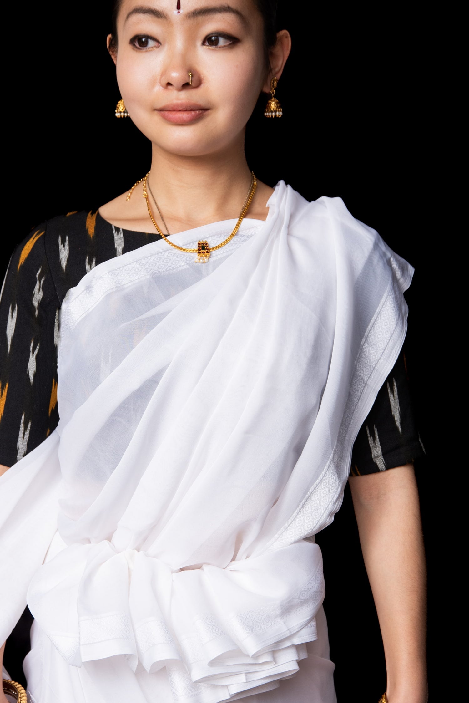 こちらのサリー、特徴的なのが真っ白な生地がつかわれていること。インドでは、白いサリーは珍しく、なかなか手に入りません。スリランカだと礼服として白いサリーが着られていたりします。プレーンなボディ部分に、片側だけ織り模様のボーダーが施されていますが、それも含めて全部真っ白!肩から垂れ下がる先まで同じデザインです。