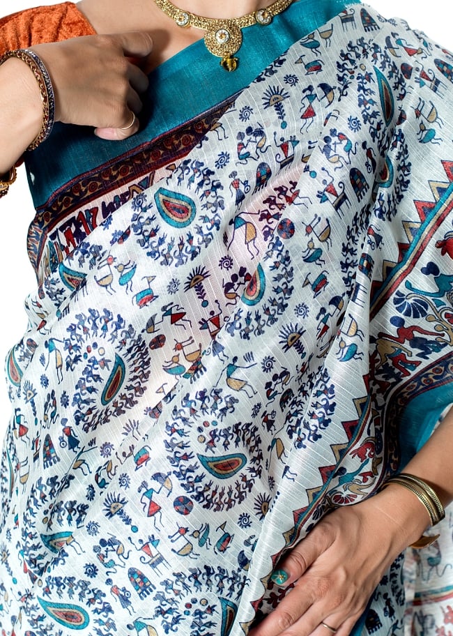 タッサーシルク風の光沢サリー【ワルリ画・ペイズリー柄】の類似商品