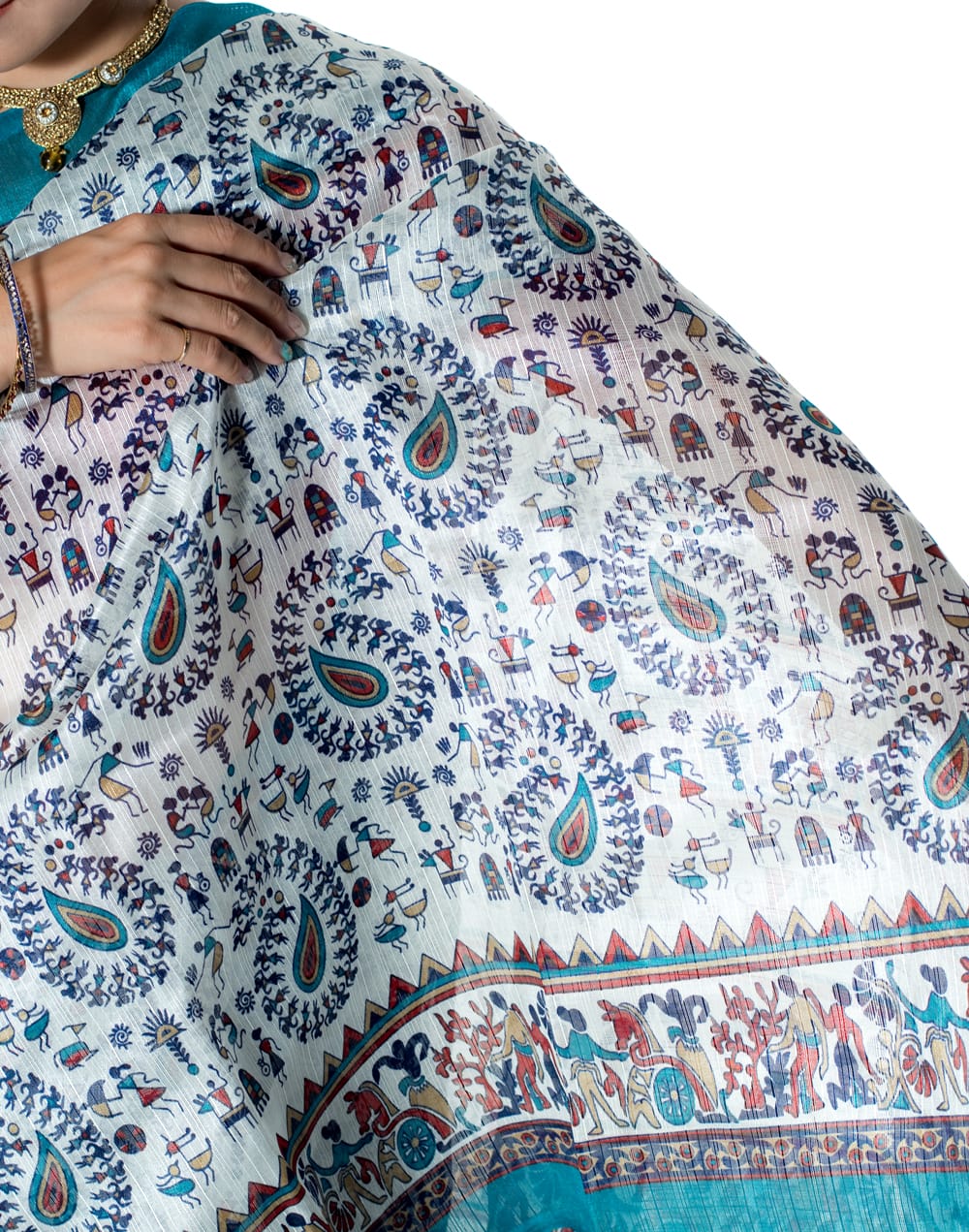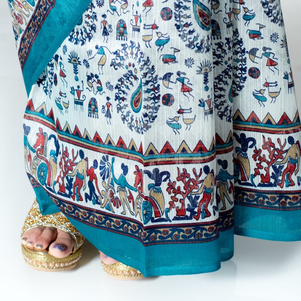 タッサーシルク風の光沢サリー【ワルリ画・ペイズリー柄】