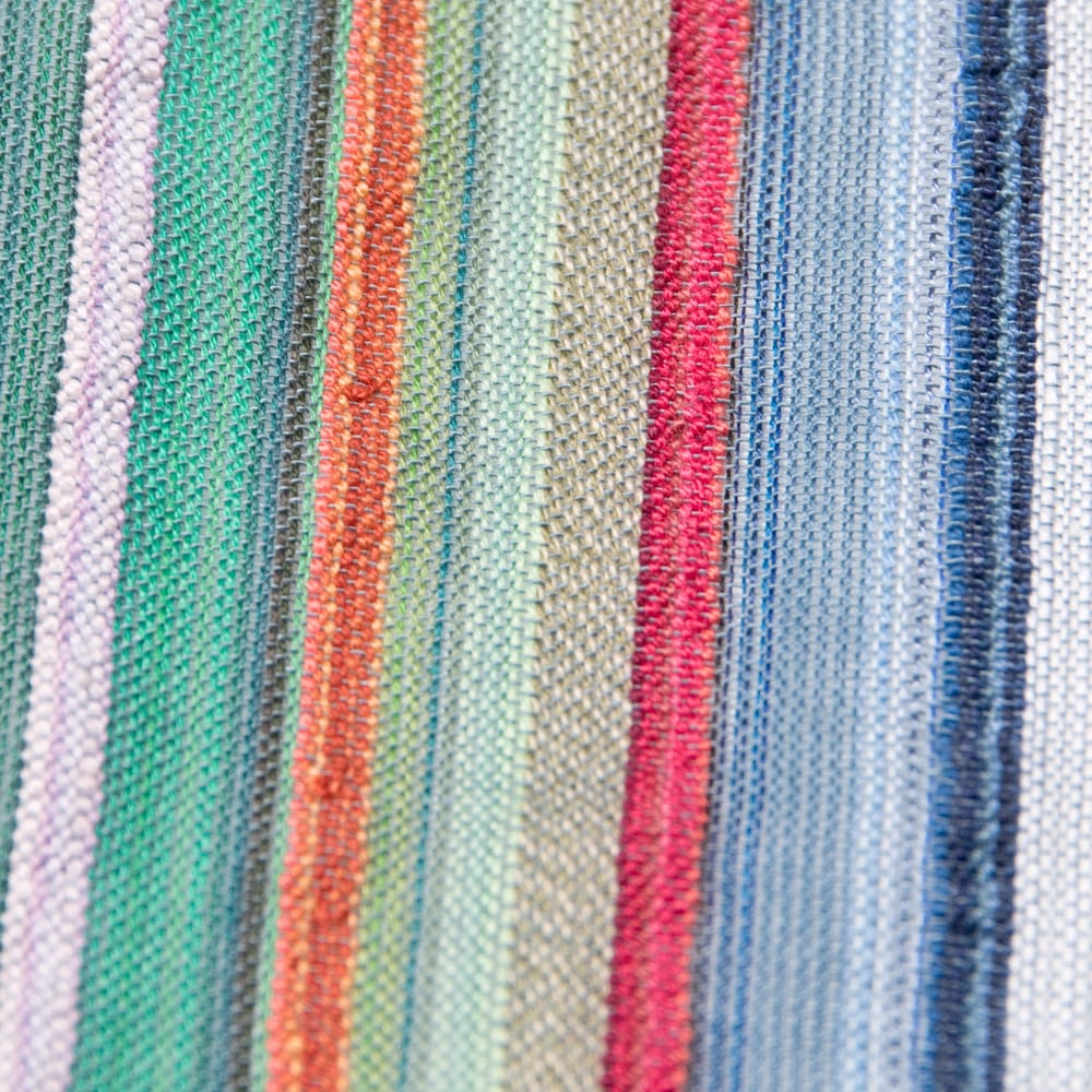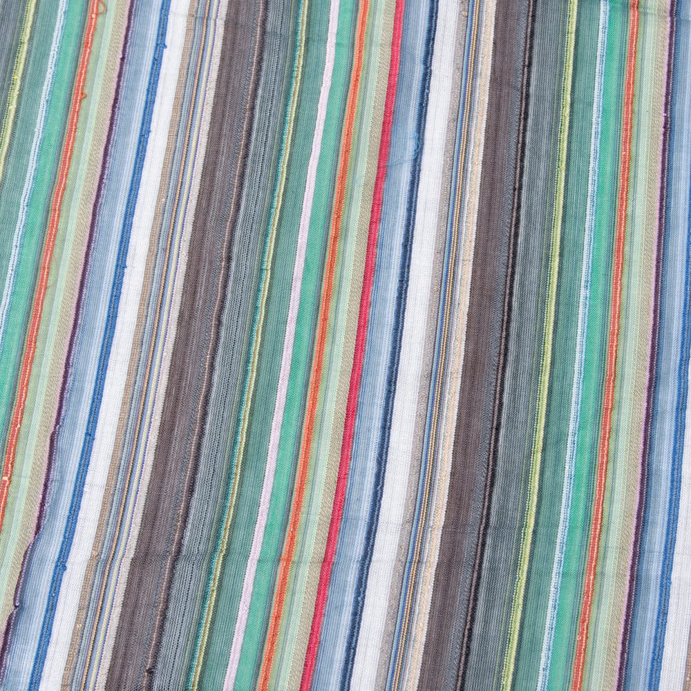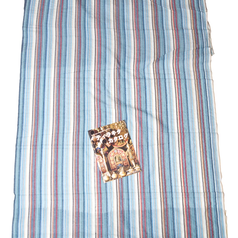 【画像を追加しました 2019-10-11】\r\nカジュアルな木綿着物に合わせる「ファブリック帯(兵児帯?)」にするつもりで購入しました。\r\nインドの綿製品には、機械織でもどこか素朴な風合いがあって、和物にもなじみやすいようです。\r\nストライプの中の一色と同じ色の着物に合わせると、コーディネートがまとります。\r\n一晩水通しをしたら、糸の色ごとに縮み方が違っていて「コットンリップル」や「しじら織」にも通じる凹凸ができました。そこがまた、味わいになっています。\r\nやさしい感じです。ストライプの色数が意外に多いので、いろんな木綿着物と合わせやすいです。\r\n 綿ですので普段用として気兼ねなく締めて、洗うのも簡単です。お値段も既製品の木綿帯(ヘタな絹の帯より高いものもあります)よりずっとお手頃ですので、他の色でもリピートしたいと思います。