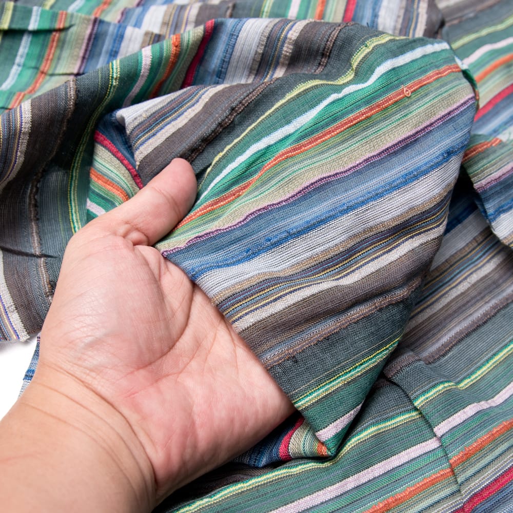 思ったより薄手で、透け感のある生地でした。ルンギの布だということで、試しに腰に巻いてみたら、とてもかわいくて、インドのおじさんはこういうのを巻いてるんだと思ったら、何だかわくわくしました。ストライプがカラフルで、日本にはないような感じのストライプなので、とてもいいと思います。生地が、何だか変なにおいがしたので、一度洗ったら、子供の浴衣みたいなシボシボ感のある布になりましたが、それもまたよかったです。ズボンを作ろうと思って買ったので、透けるのは誤算でしたが、何とか裏地をつけて、このかわいい生地を活用したいと思います。