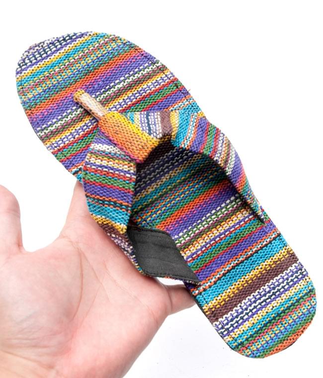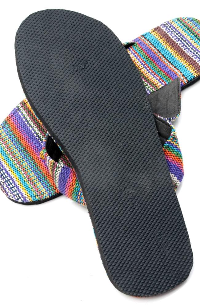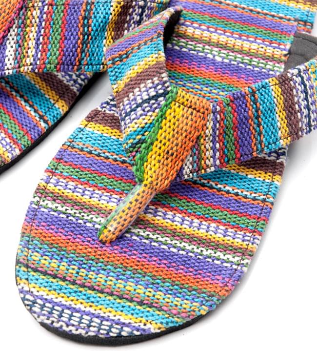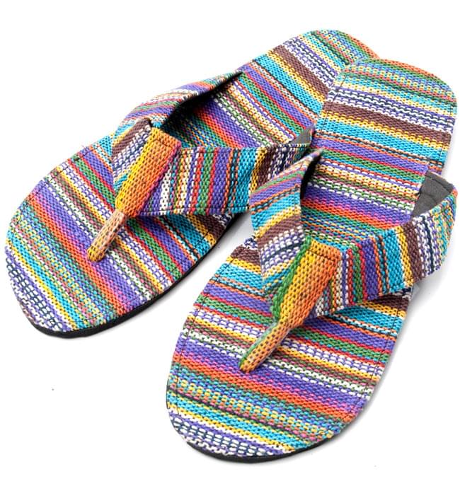 このサンダルの布地はゲリと呼ばれる、ネパール独自の生地が使われています。カラフルなこの生地は、ネパールの人たちが自分たちが好きな色合いで作っているもので、太めの糸で織られた温かみのある風合いです。ちょっと粗めの生地ですのでワイルドな雰囲気にもピッタリです。カラフルなのに、どこか落ち着きがあるので、さり気なく足元を彩りたいときにお勧めです。■気軽に履ける夏の必須アイテム