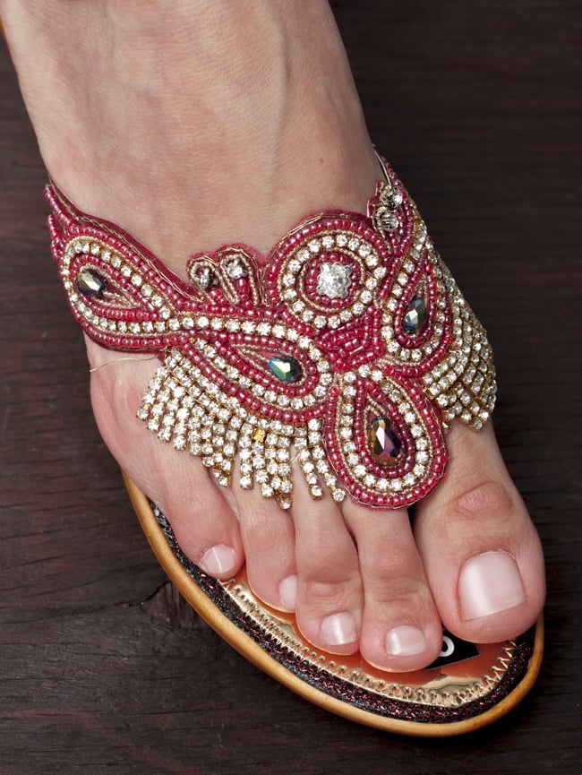 キラキラとゴージャスなストラップシューズがやって来ました。ビーズやスパンコールがキラキラと輝き、ところ狭しと刺繍が施されています。このシューズでパンジャビドレスやサリーを合わせたら、コーディネートは完璧だね!というインドスタイルです。どちらも微妙にデザインが異なりますが、どれが良いか迷ってしまうくらいバランスの取れた配色にうっとりします。