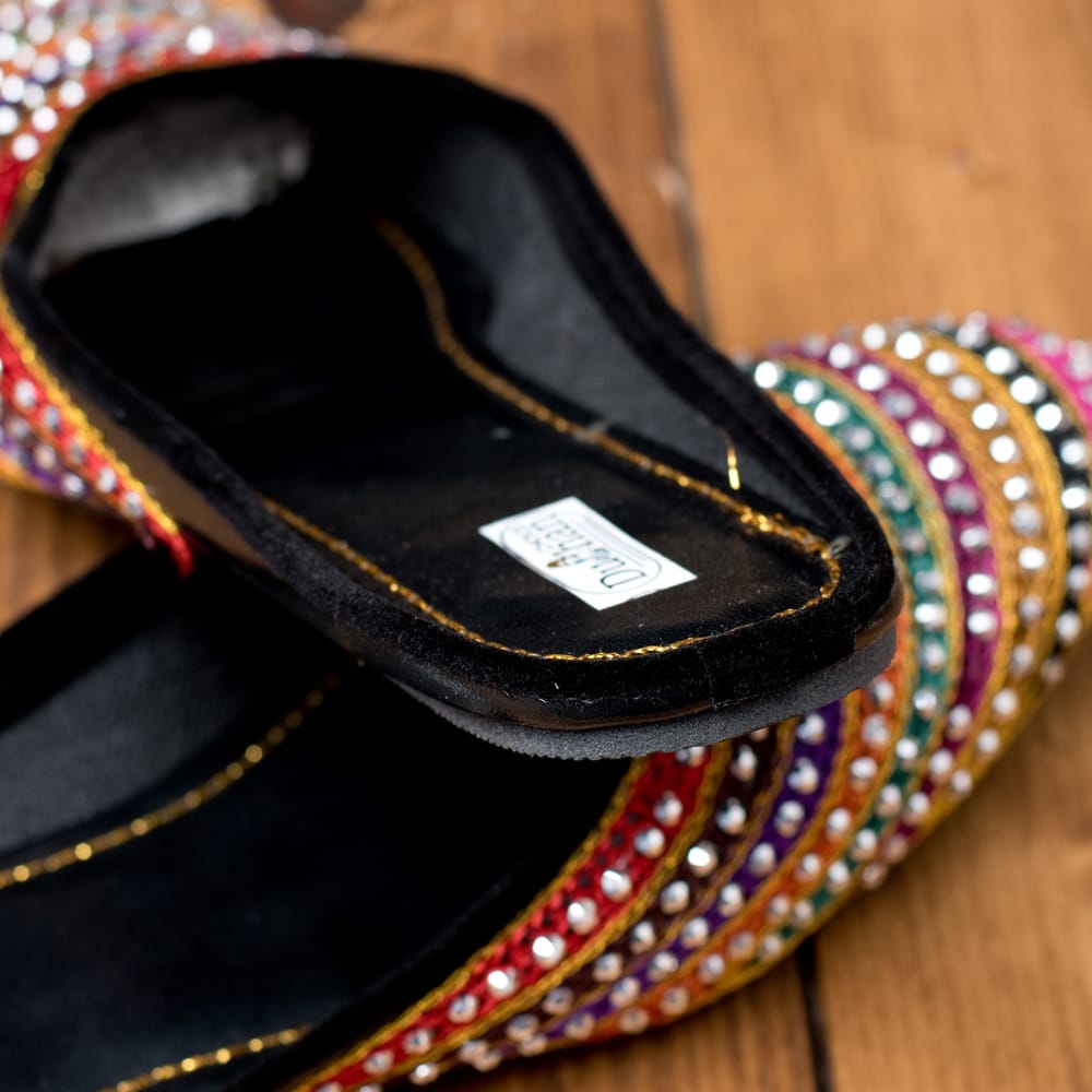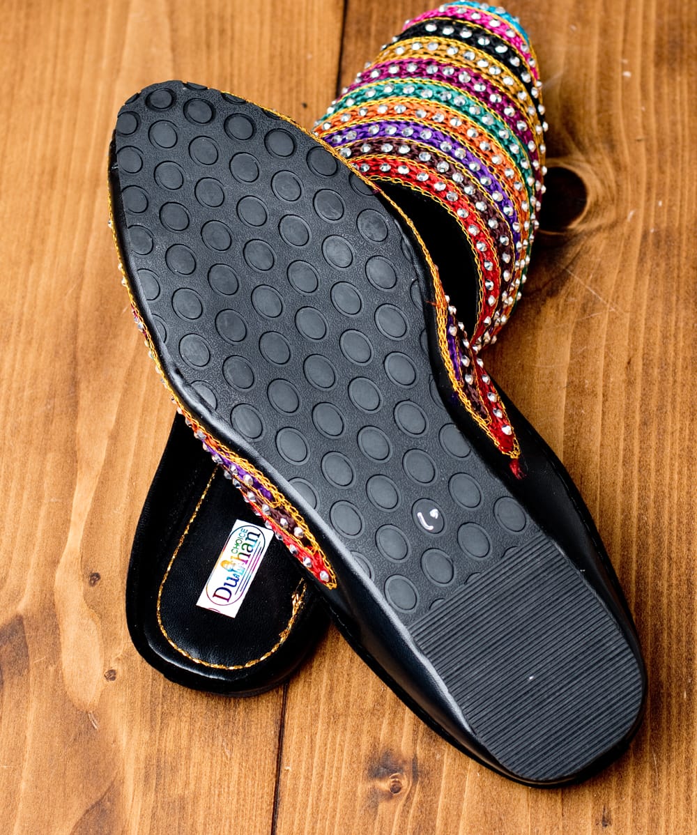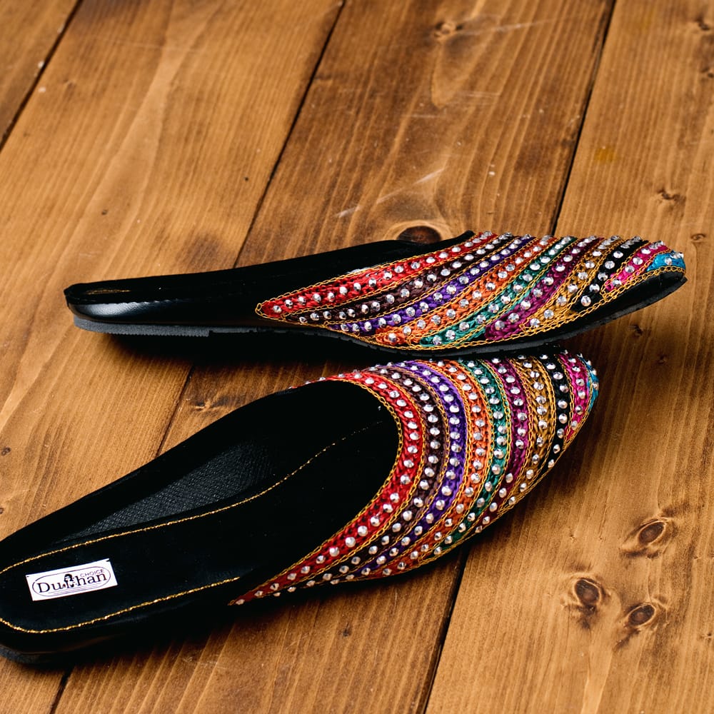 かかとのないスリッパサンダルです。ゆるい着こなしや、リラックスしたいときにぴったり。一般的なスリッパサンダルは落ち着いたシンプルな感じが多いと思いますが、さすがインド。靴にはところ狭しと華やかなラインストーンやビジューなどが施され、キラキラと輝き足元が華やかになります。インドの女性って本当に華やかなデザインが好きなんだな?と改めて実感する一品です。また、デザインとしてほとんどスリッパと変わらないので、室内履きとしてもかわいいと思います。